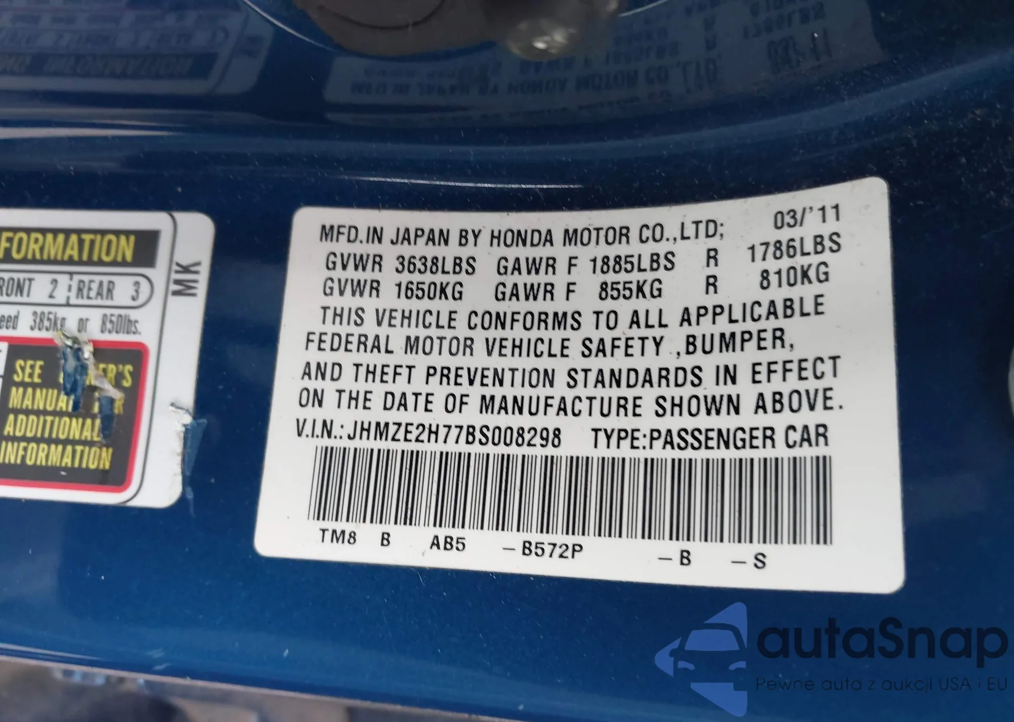 LOT: 79831385 VIN: JHMZE2H74BS011207