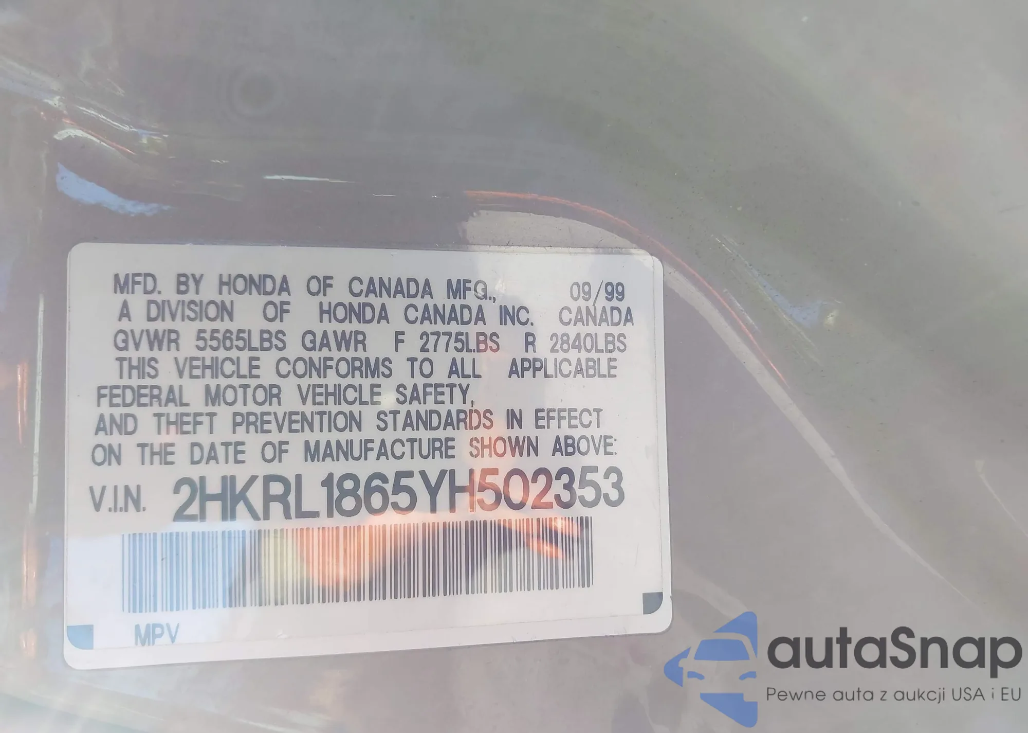 • VIN 2HKRL1865YH502353