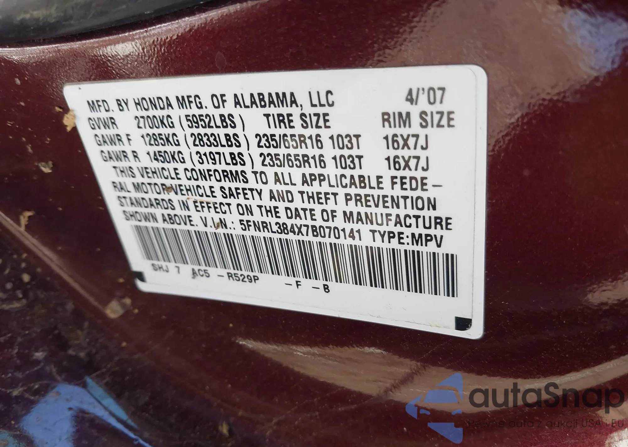 • VIN 5FNRL38207B138347