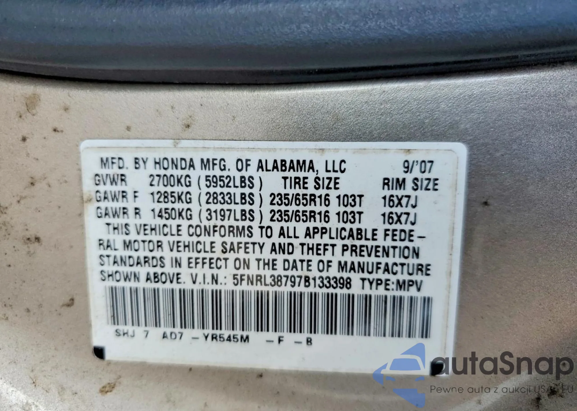 • VIN 5FNRL38797B133398