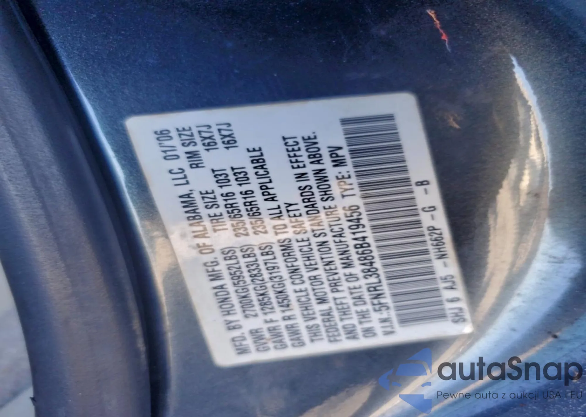 • VIN 5FNRL38486B419456