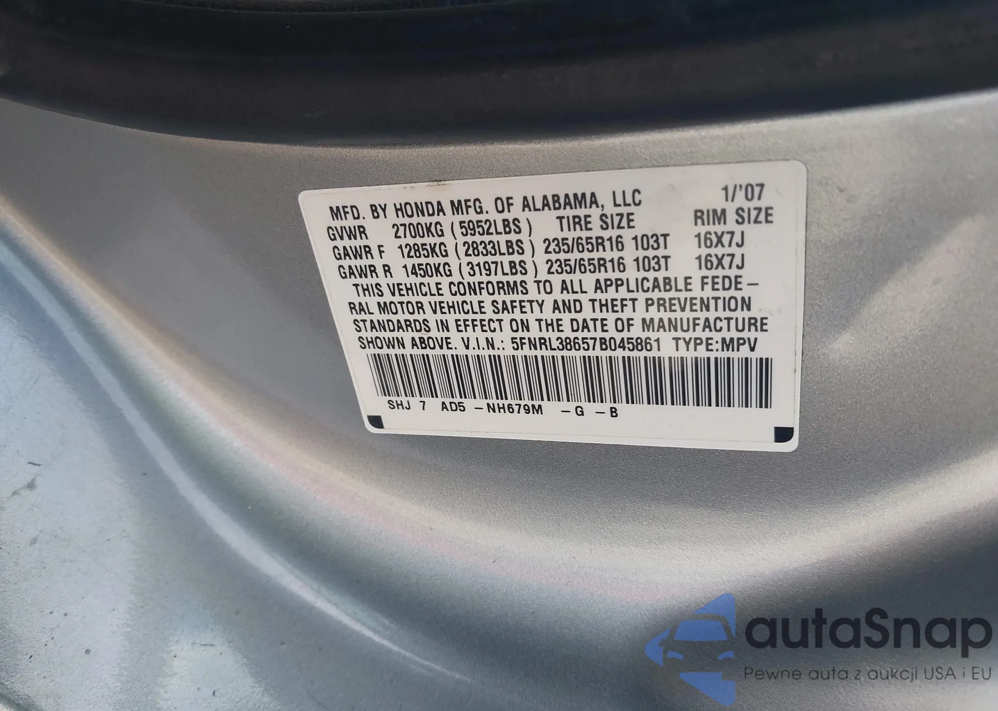 • VIN 5FNRL38657B045861