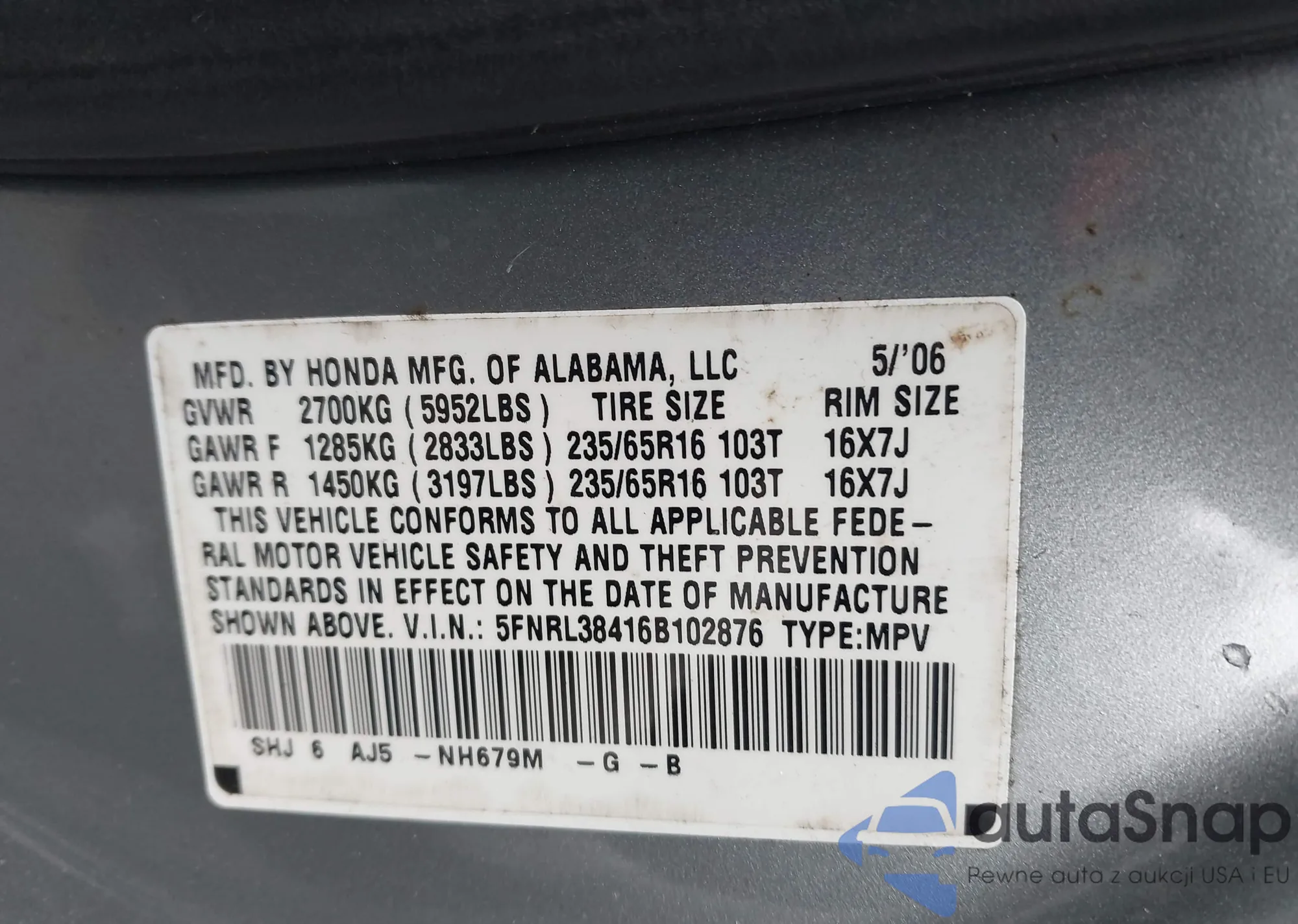• VIN 5FNRL38416B102876