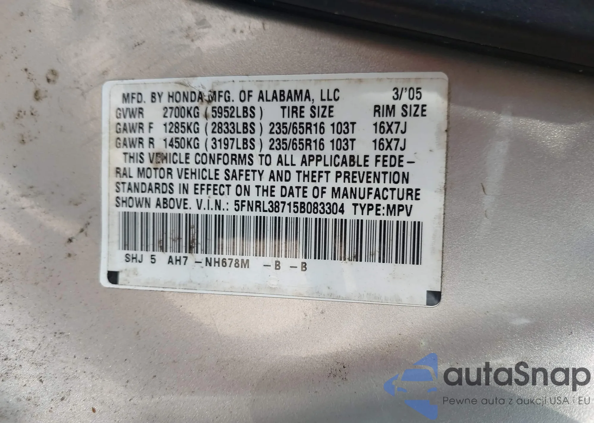 • VIN 5FNRL38715B083304
