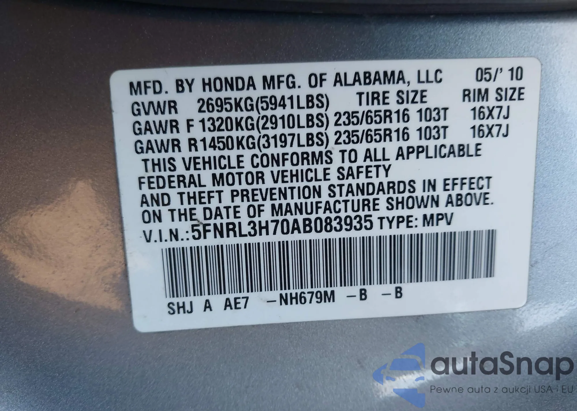 • VIN 5FNRL3H70AB083935