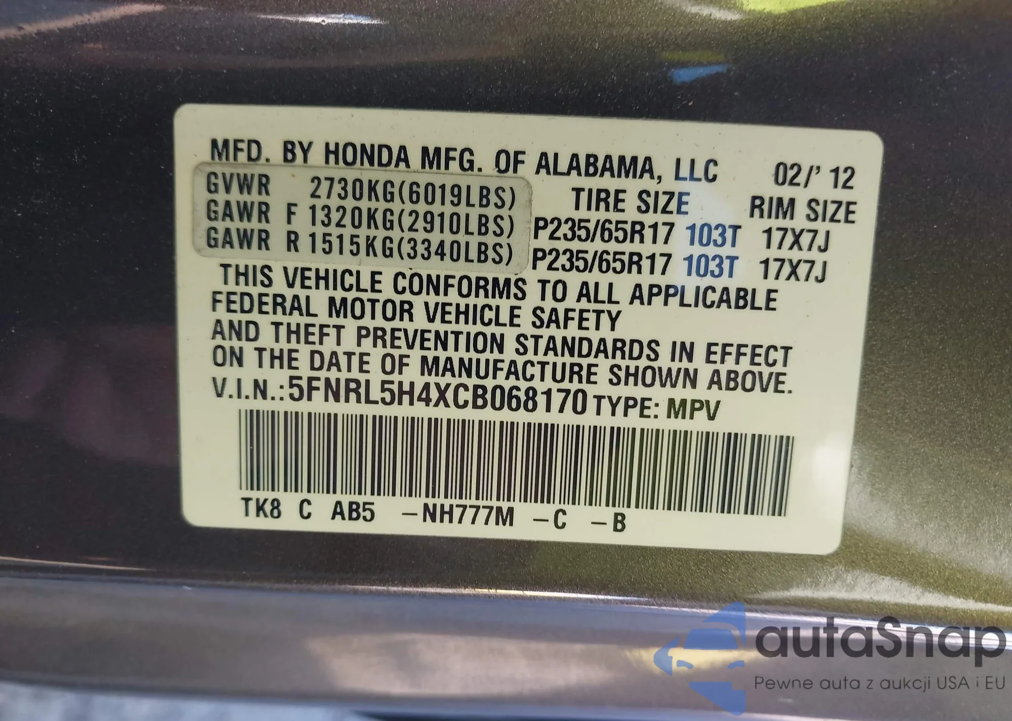 • VIN 5FNRL5H4XCB068170