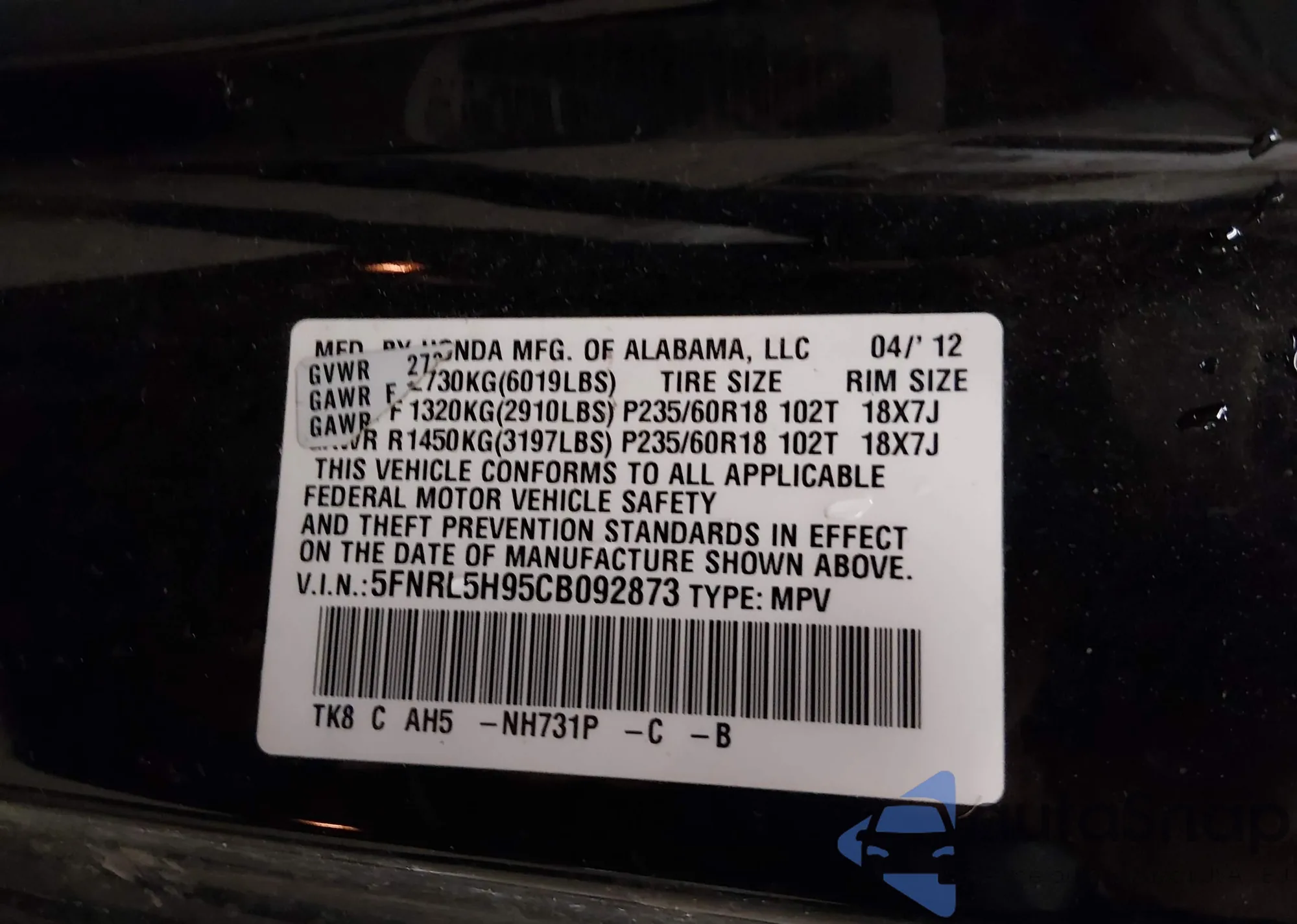 • VIN 5FNRL5H95CB092873