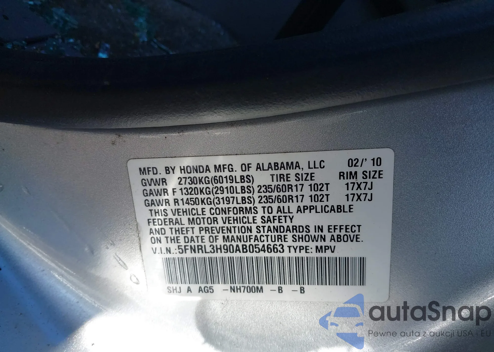 • VIN 5FNRL3H90AB054663