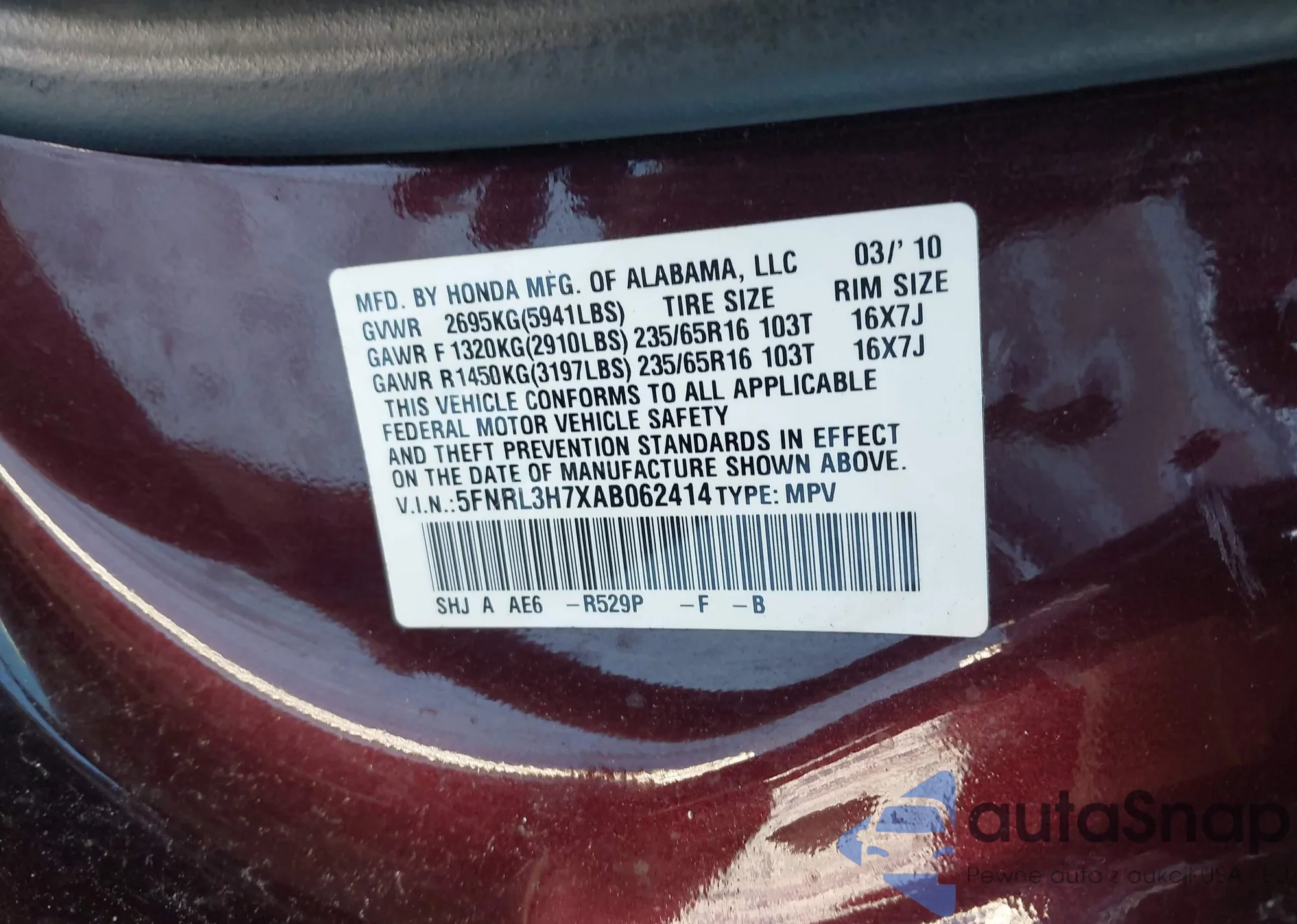 • VIN 5FNRL3H7XAB062414
