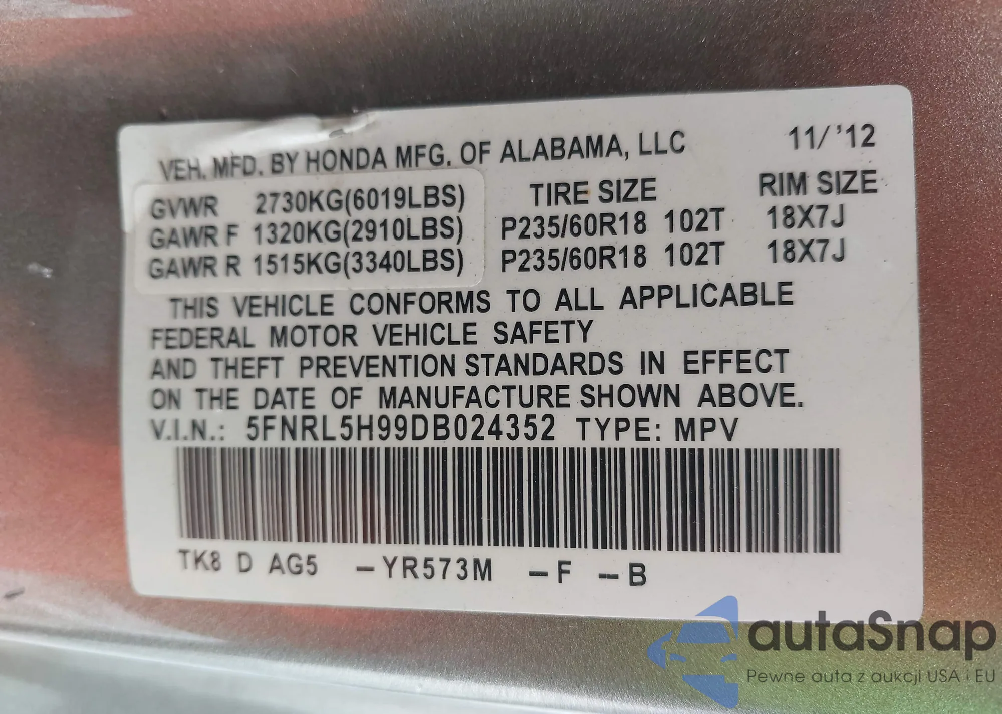 • VIN 5FNRL5H99DB024352