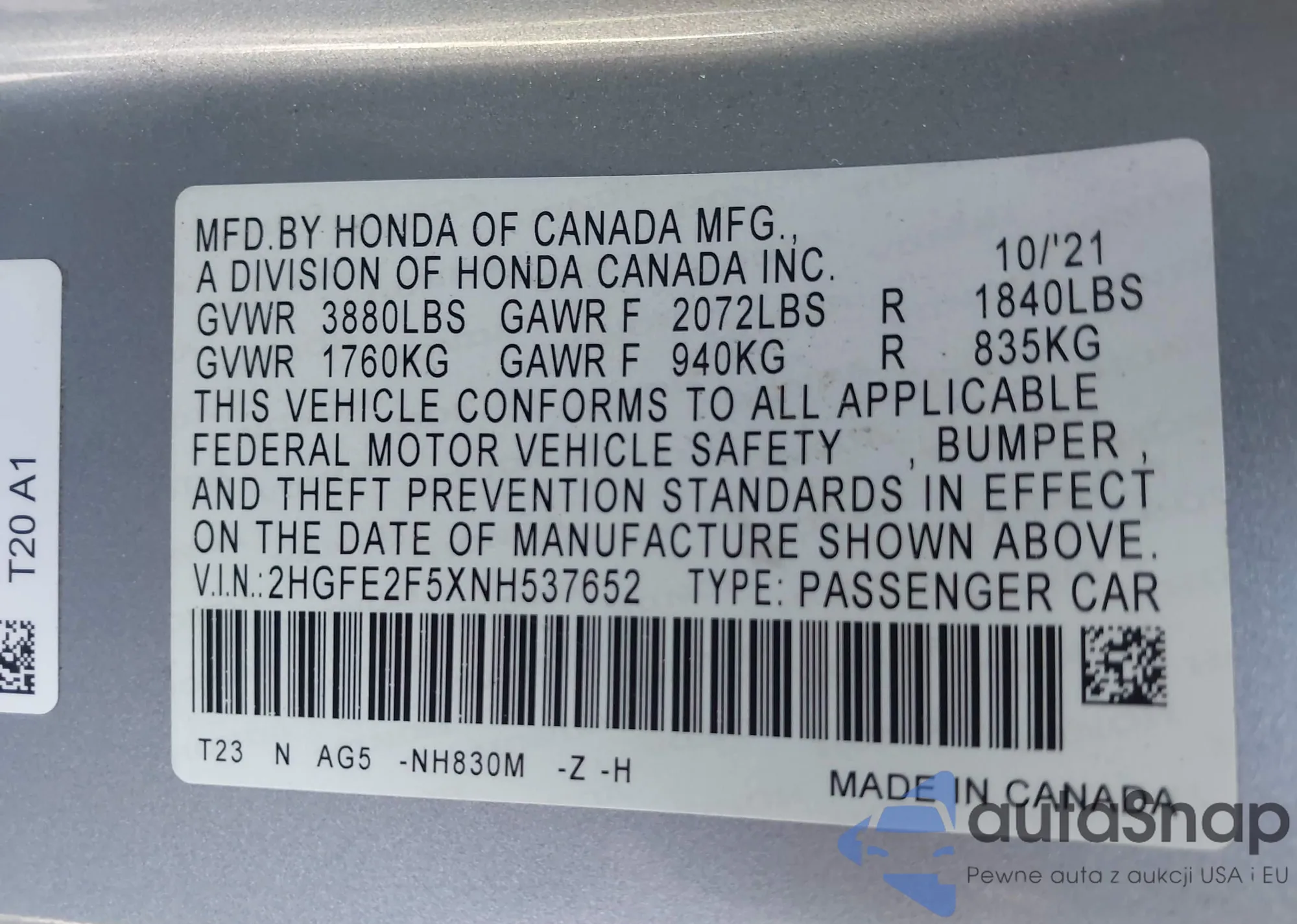 • VIN 2HGFE2F5XNH537652