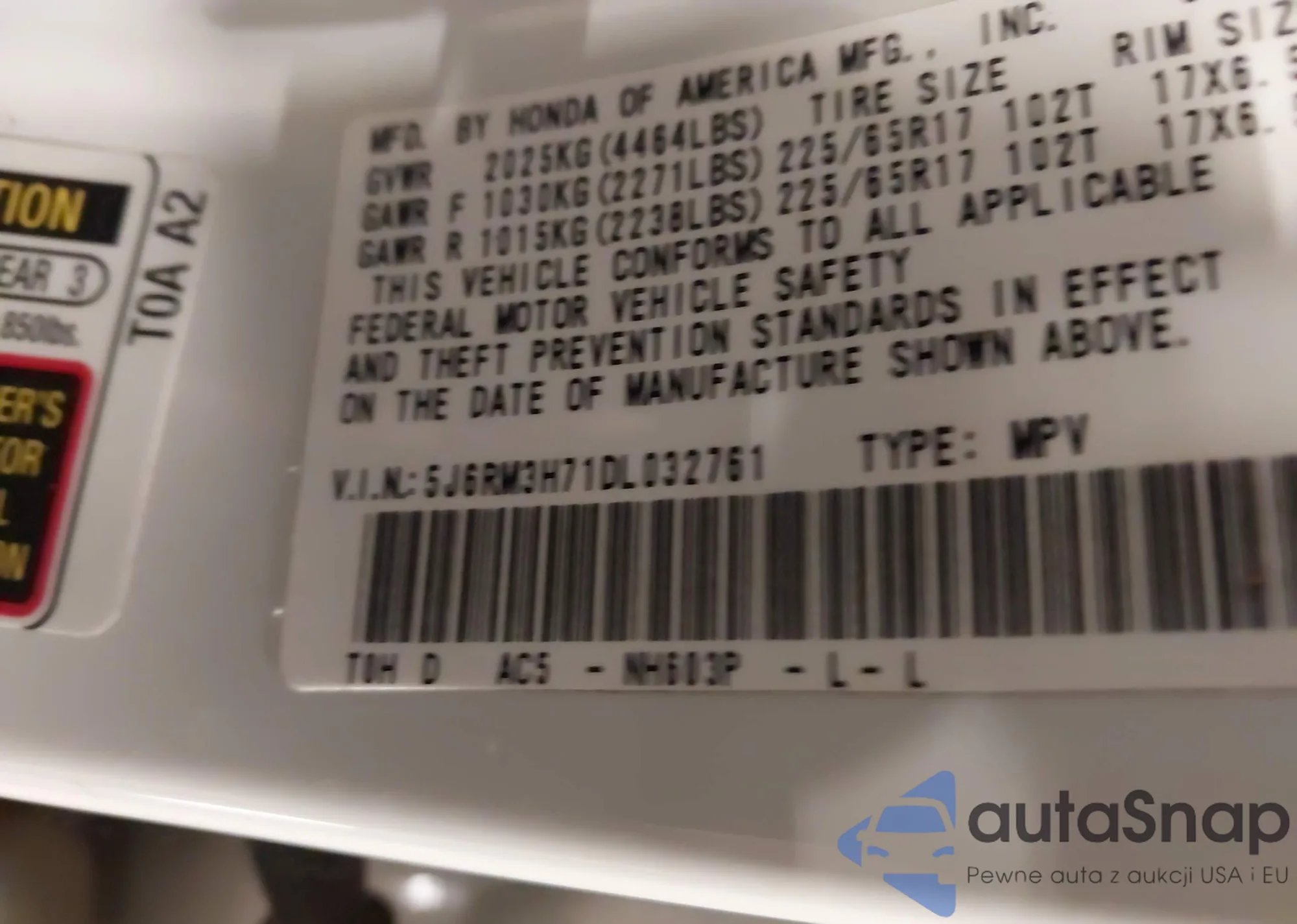 • VIN 5J6RM3H71DL032761