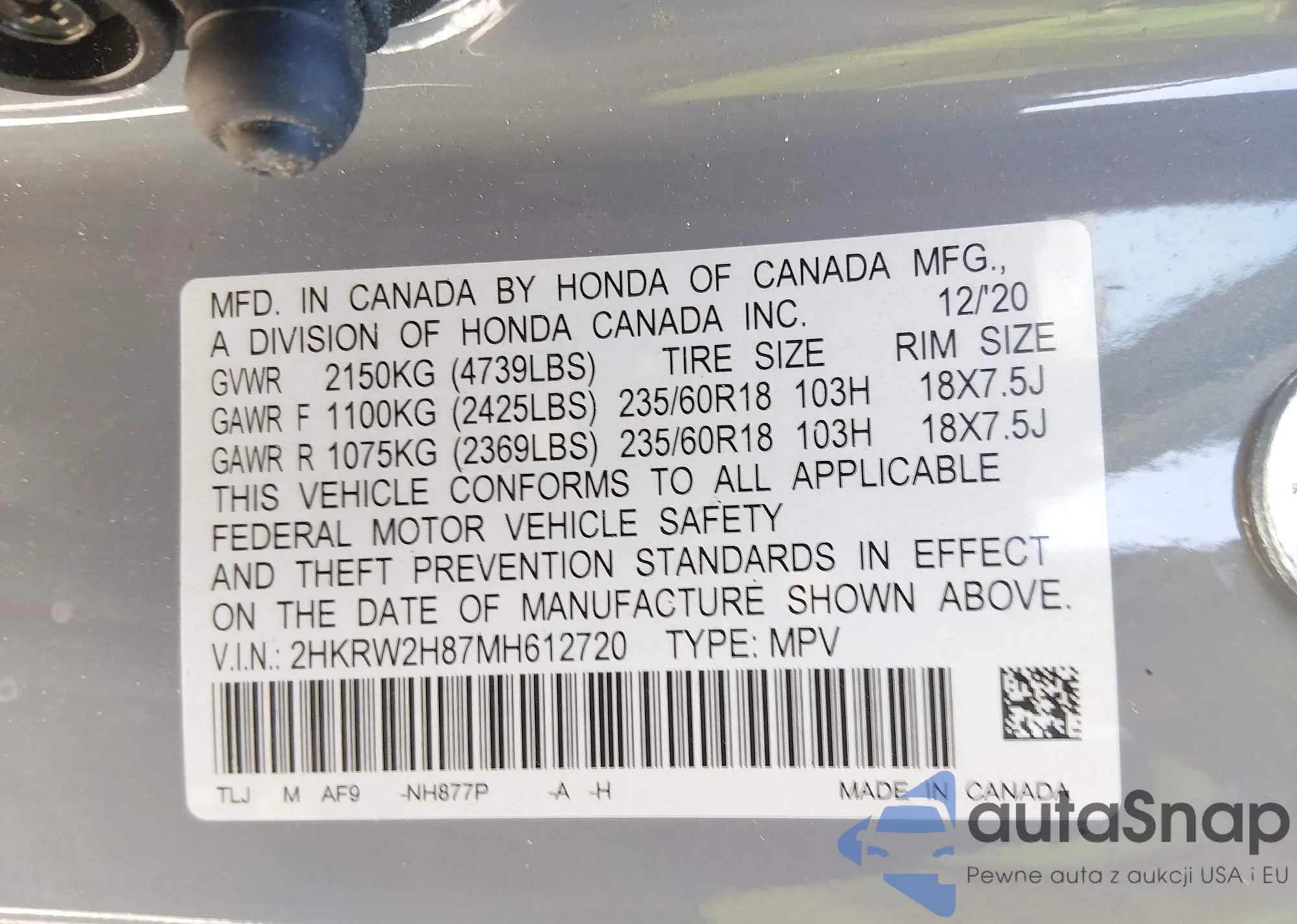 • VIN 2HKRW2H87MH612720