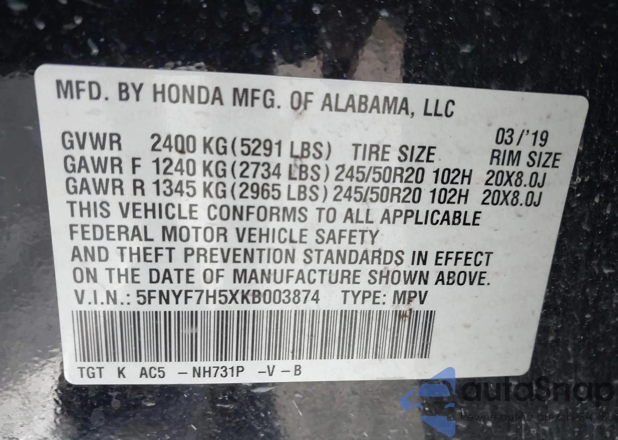 • VIN 5FNYF7H5XKB003874