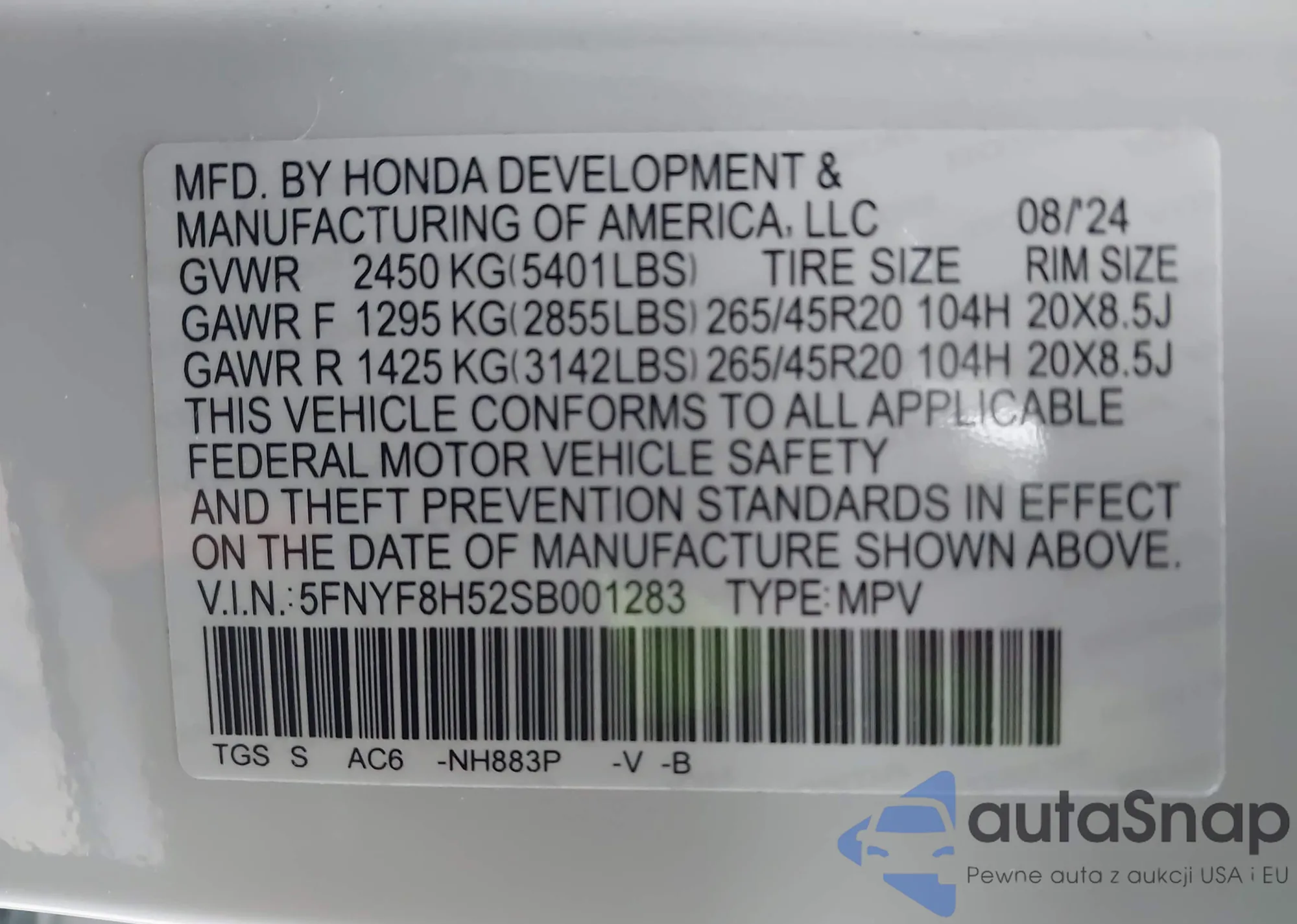 LOT: 43853780 VIN: 5FNYF8H52SB001283