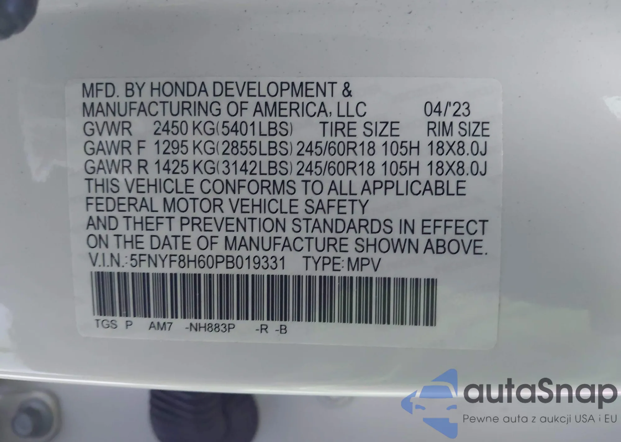 LOT: 44136397 VIN: 5FNYF8H60PB021242