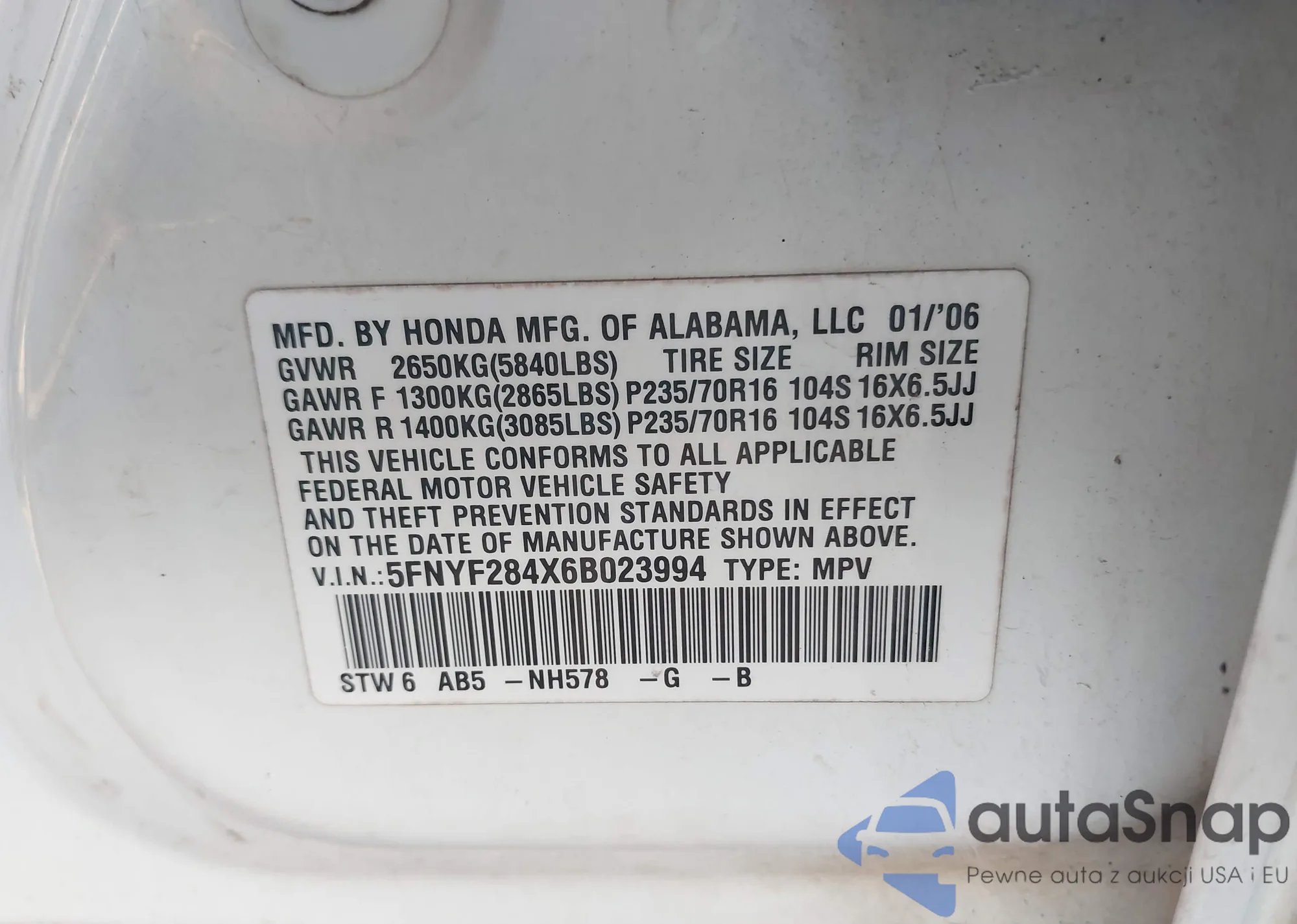 LOT: 44306229 VIN: 5FNYF28436B017082