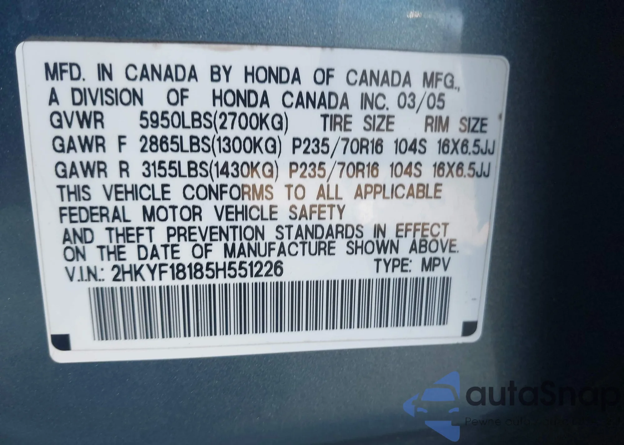 • VIN 2HKYF18185H551226