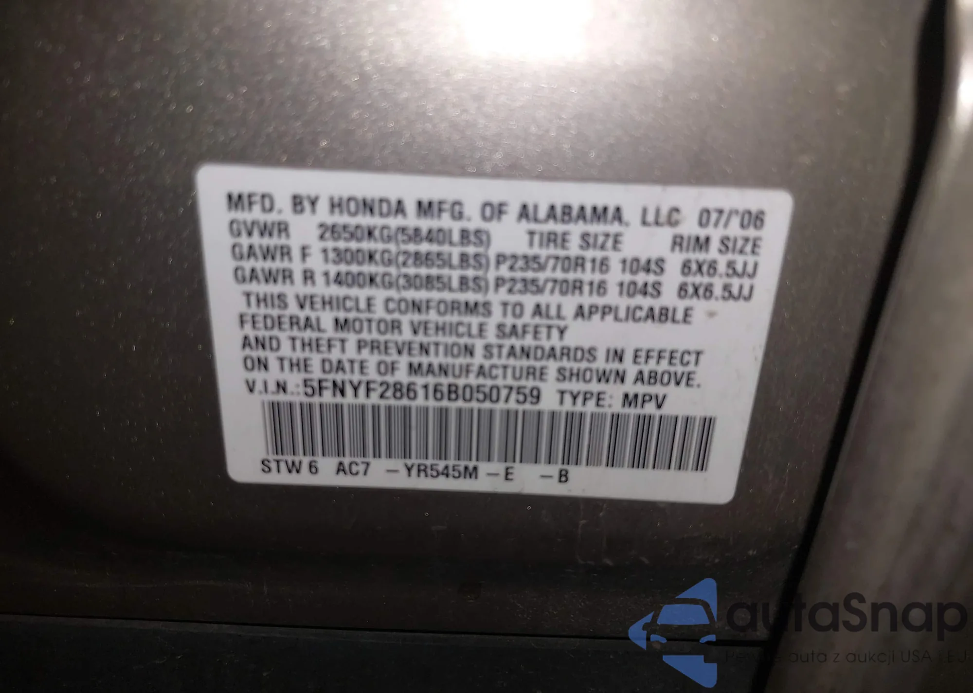 LOT: 44321143 VIN: 5FNYF28616B050759
