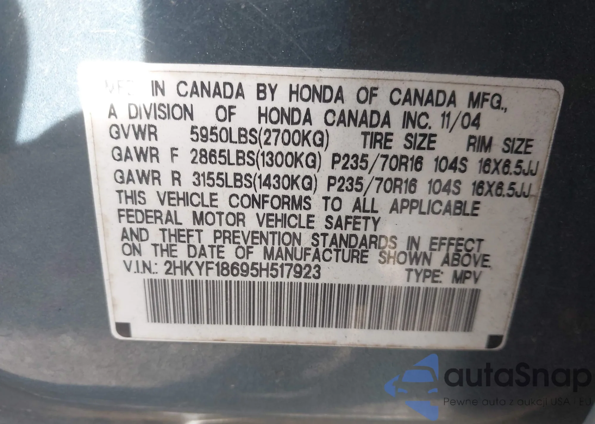 • VIN 2HKYF18695H517923