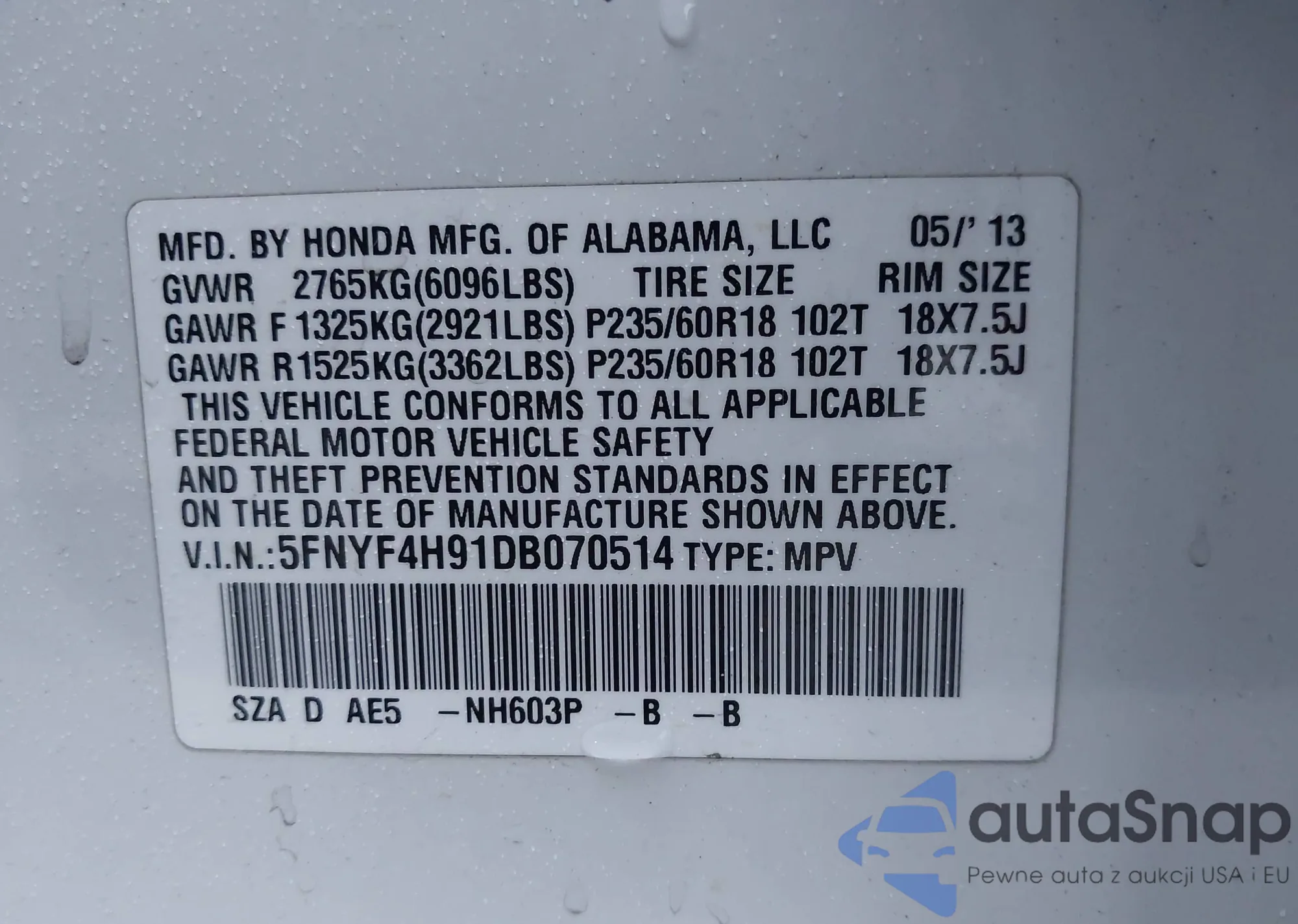 • VIN 5FNYF4H91DB070514