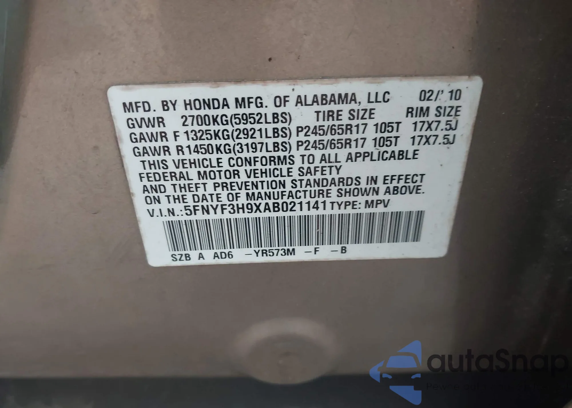 • VIN 5FNYF3H9XAB021141