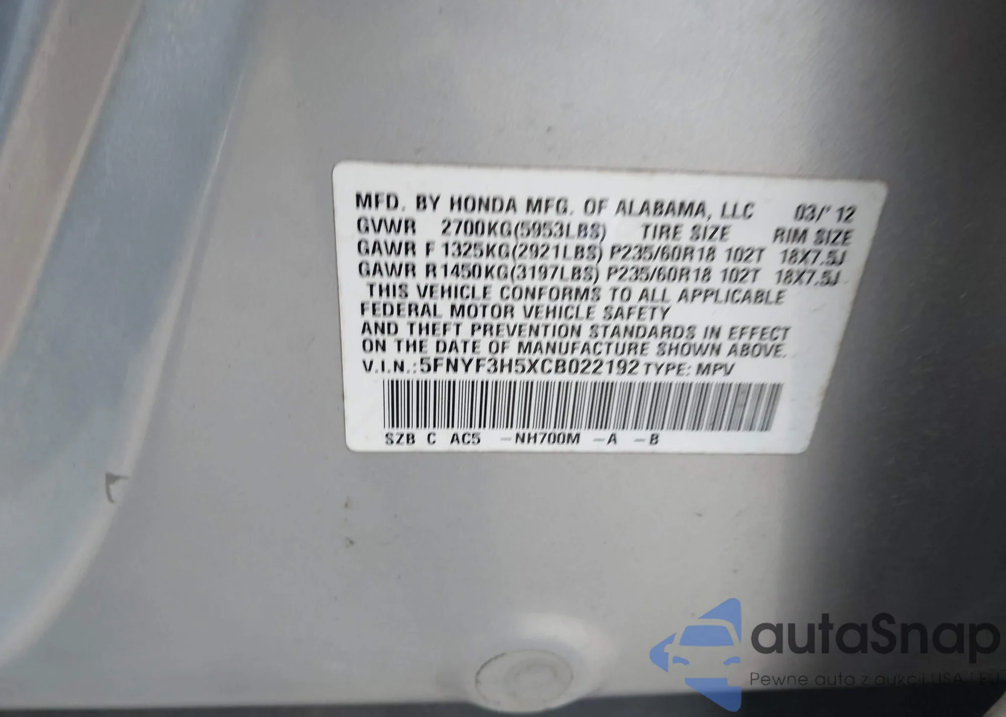 • VIN 5FNYF3H5XCB022192