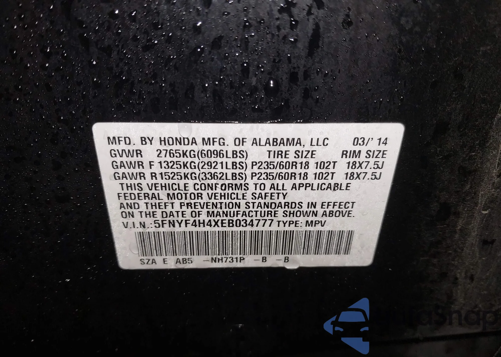 • VIN 5FNYF4H4XEB034777