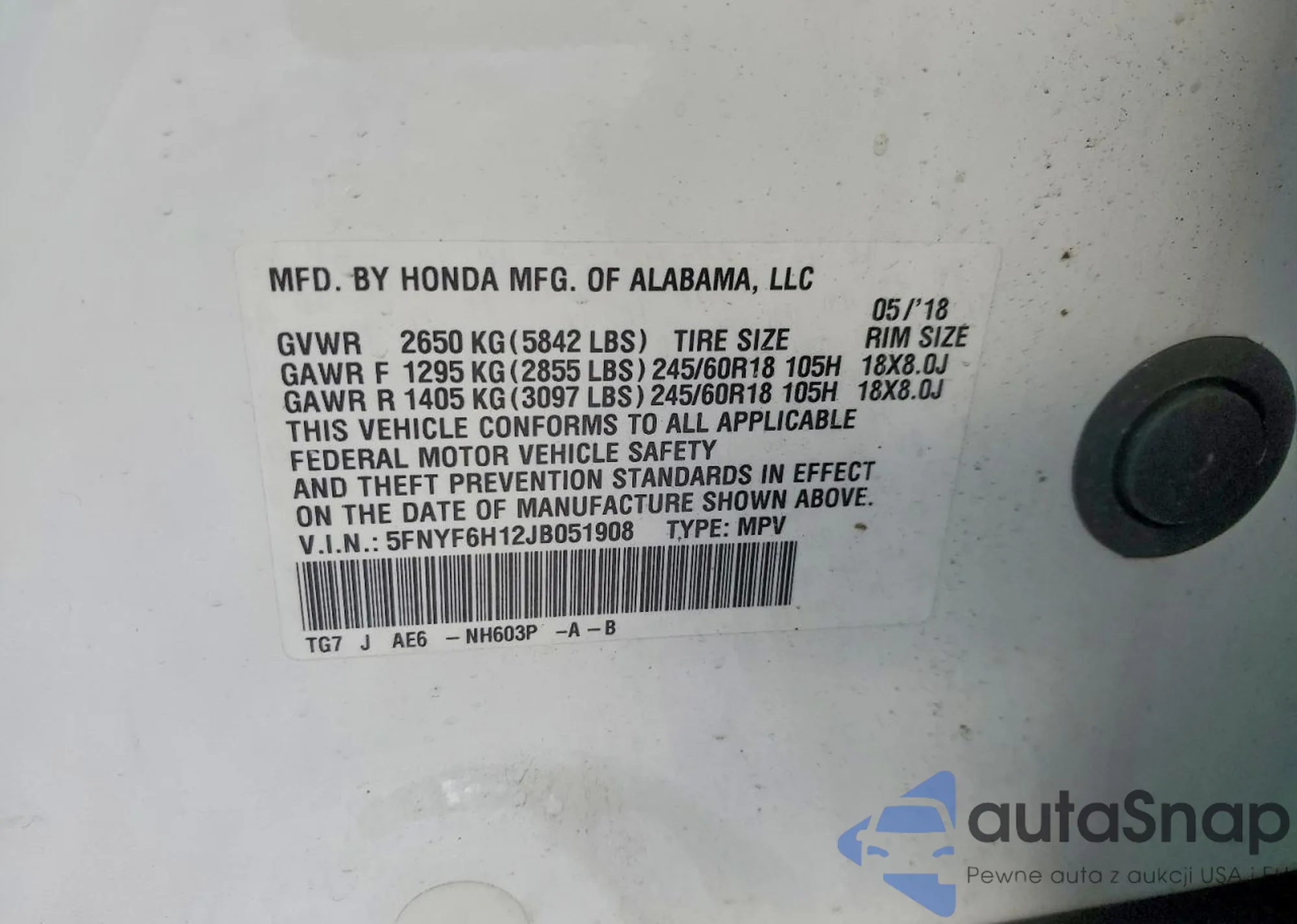 LOT: 98144605 VIN: 5FNYF6H12JB051908