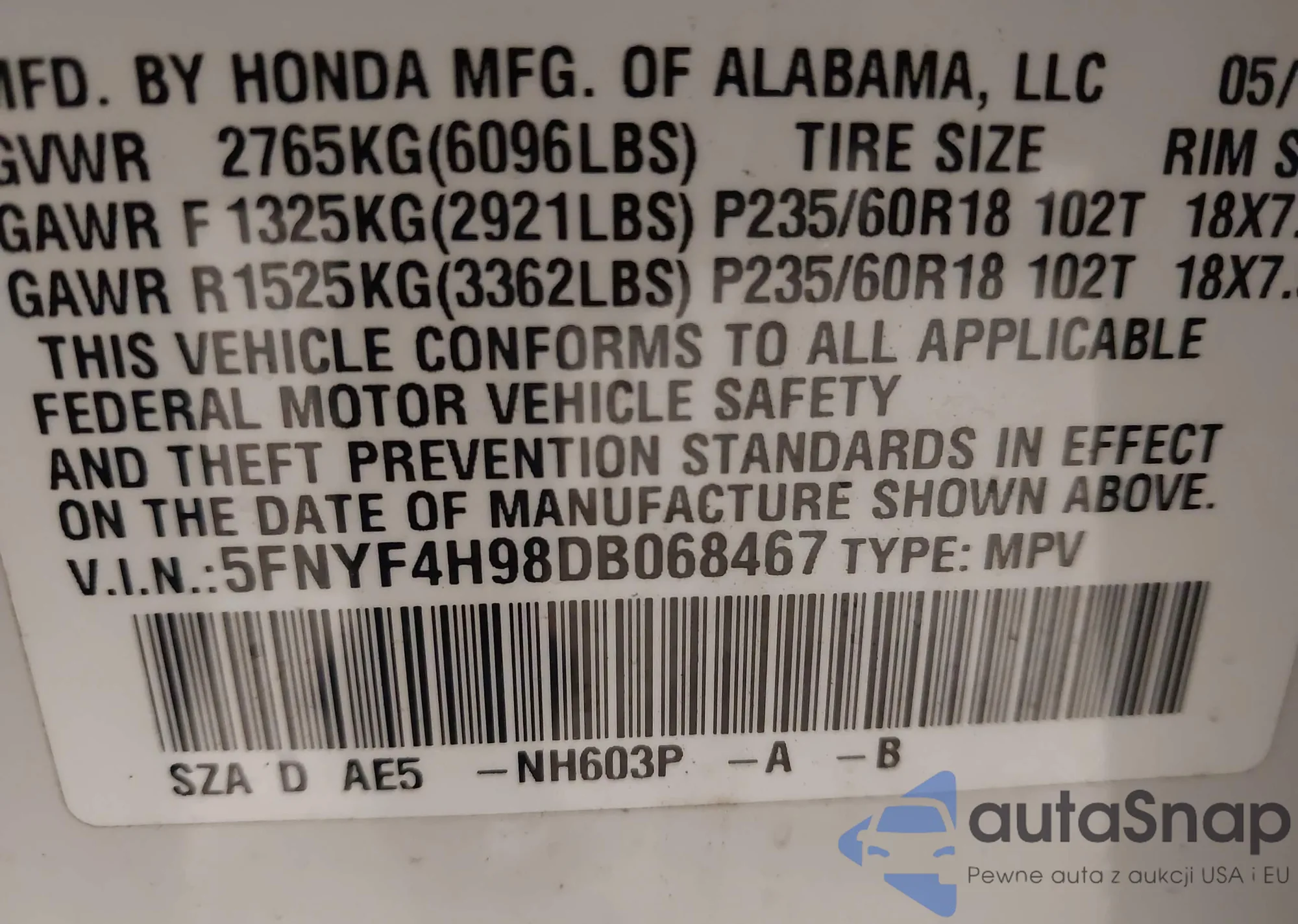• VIN 5FNYF4H58DB006273
