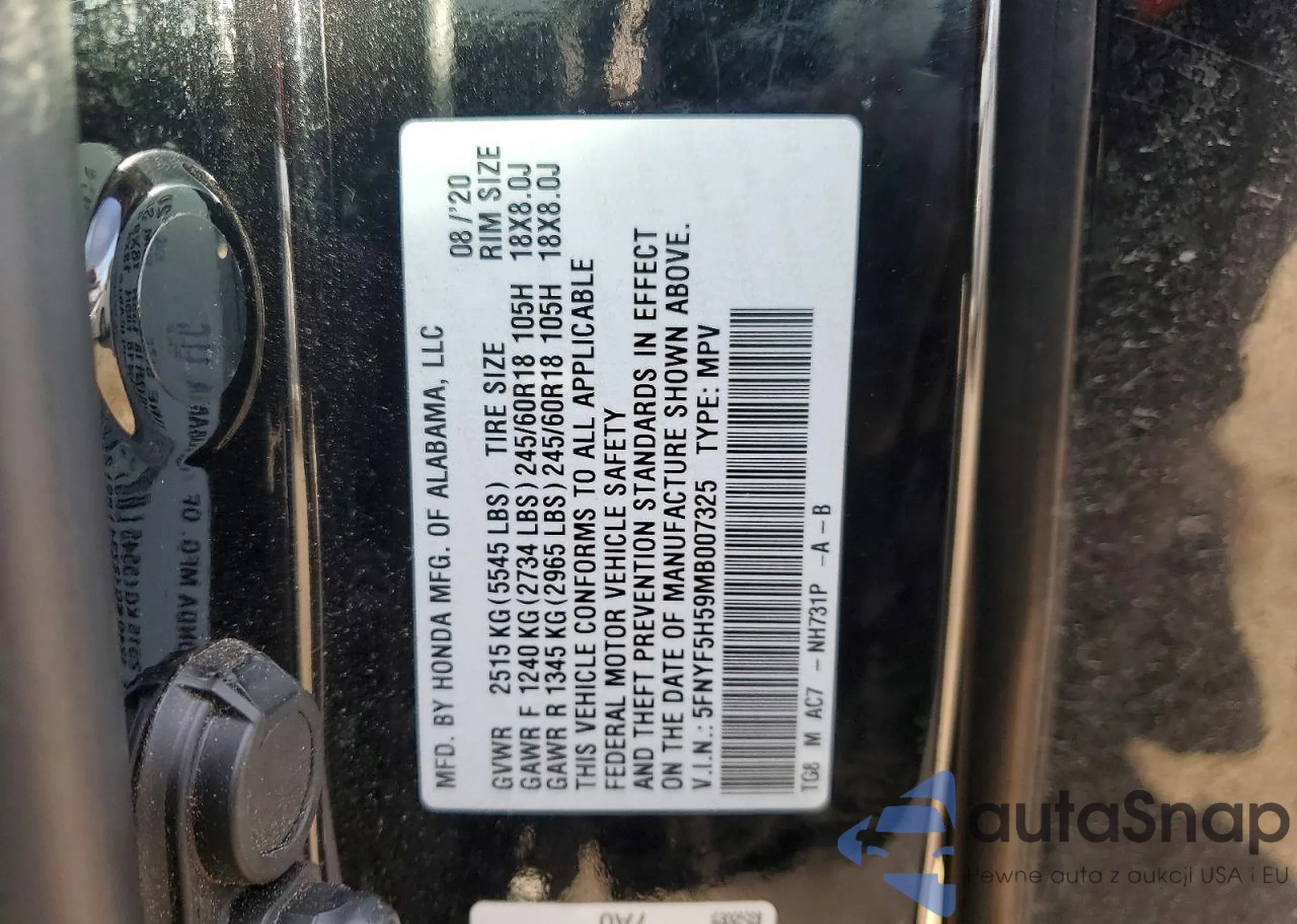 • VIN 5FNYF5H59MB007325