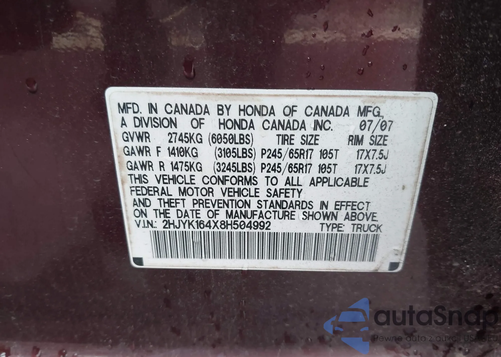 • VIN 2HJYK165X6H508112