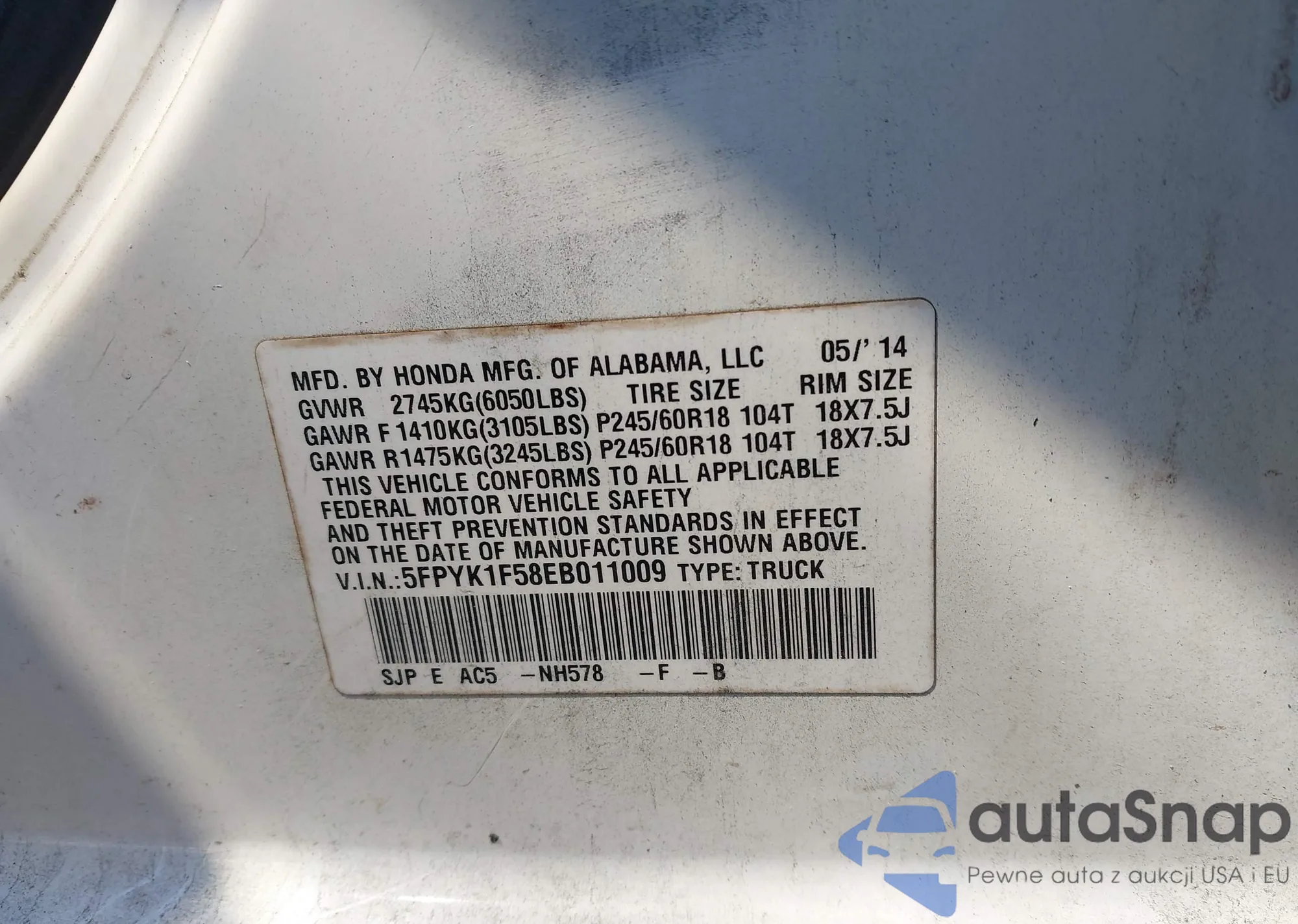 • VIN 5FPYK1F58EB011009