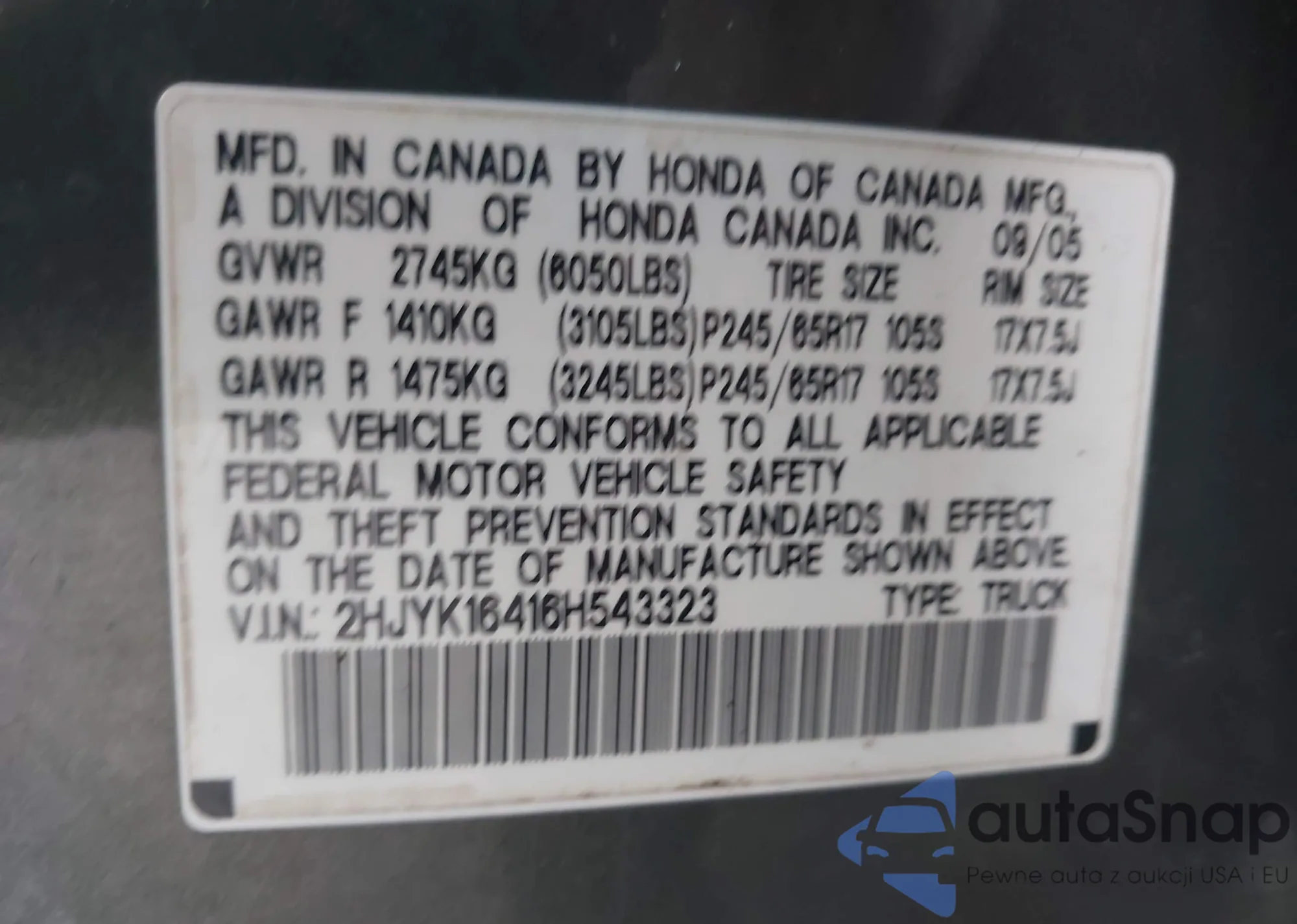 • VIN 5FPYK16239B107335