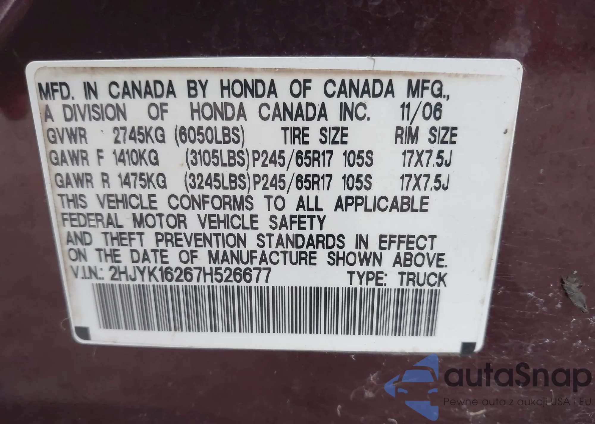 • VIN 2HJYK16267H526677