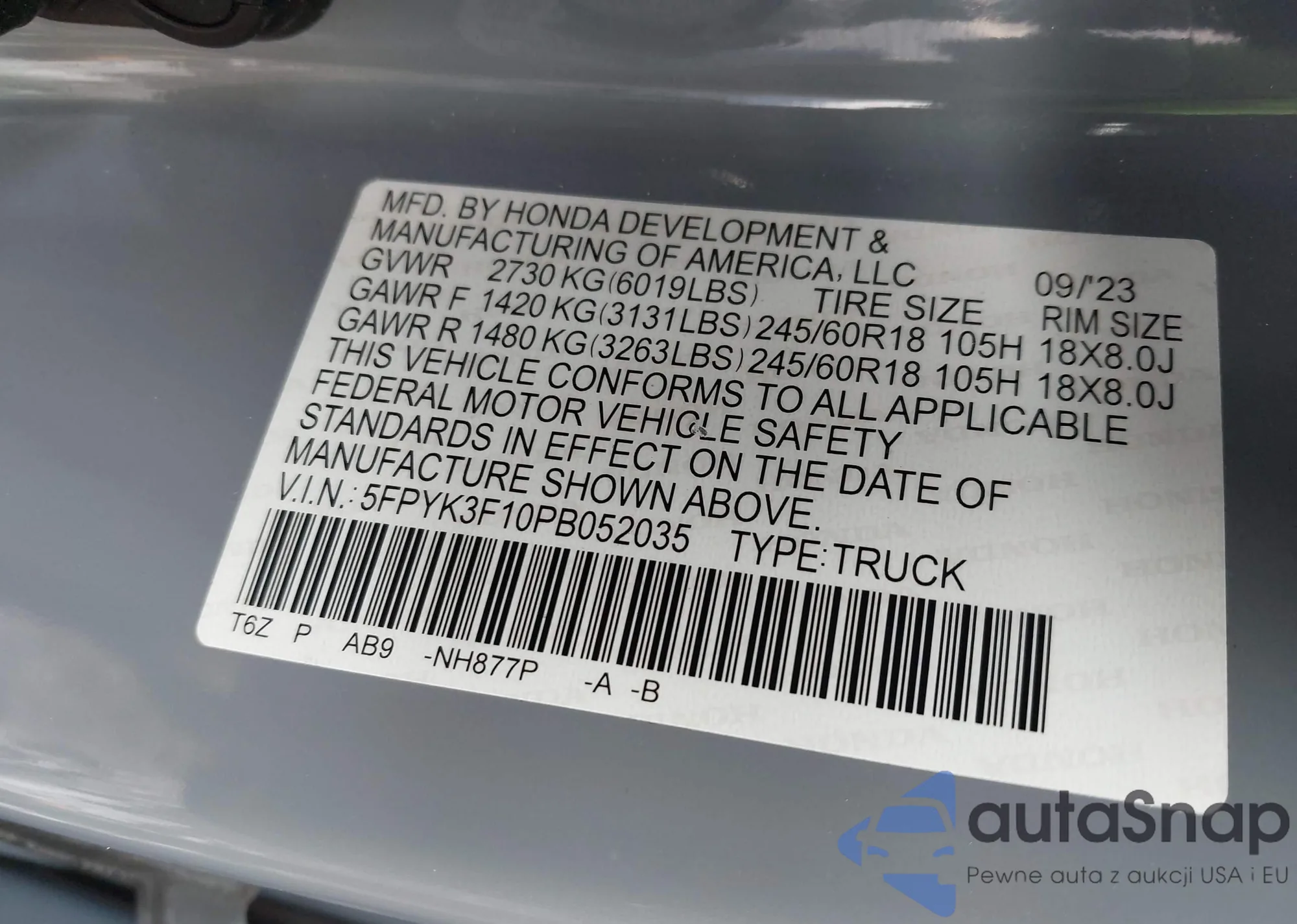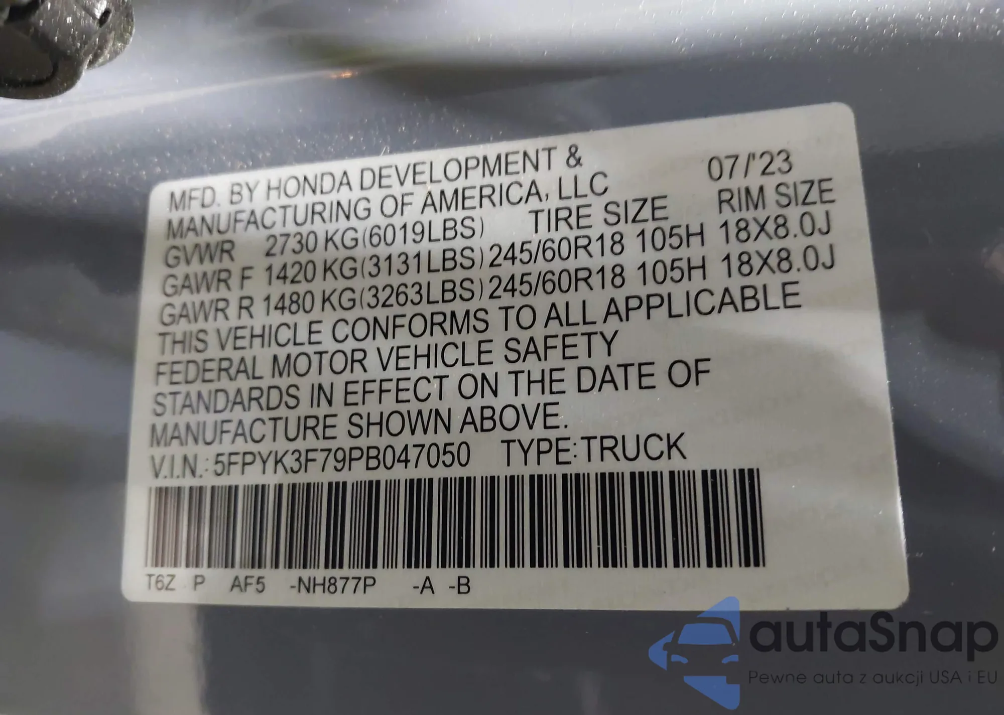 • VIN 5FPYK3F79PB047050