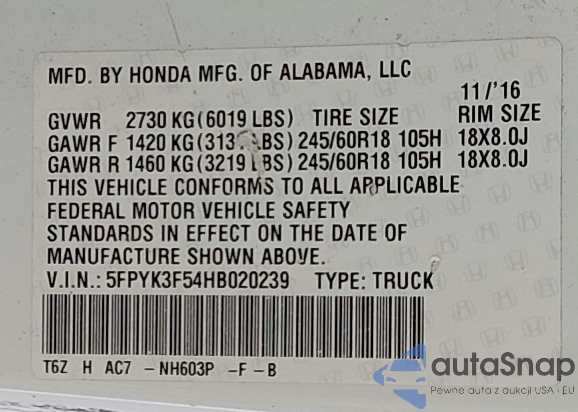 • VIN 5FPYK3F54HB020239
