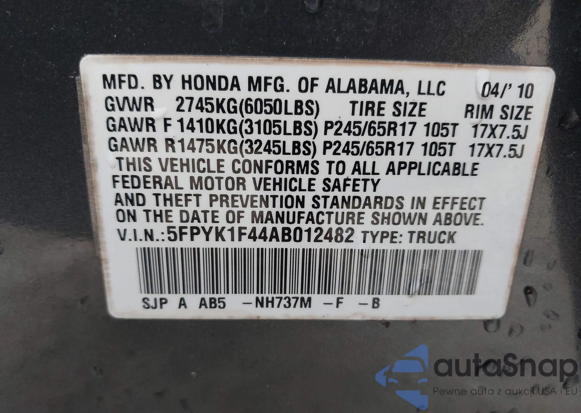 • VIN 5FPYK1F44AB012482
