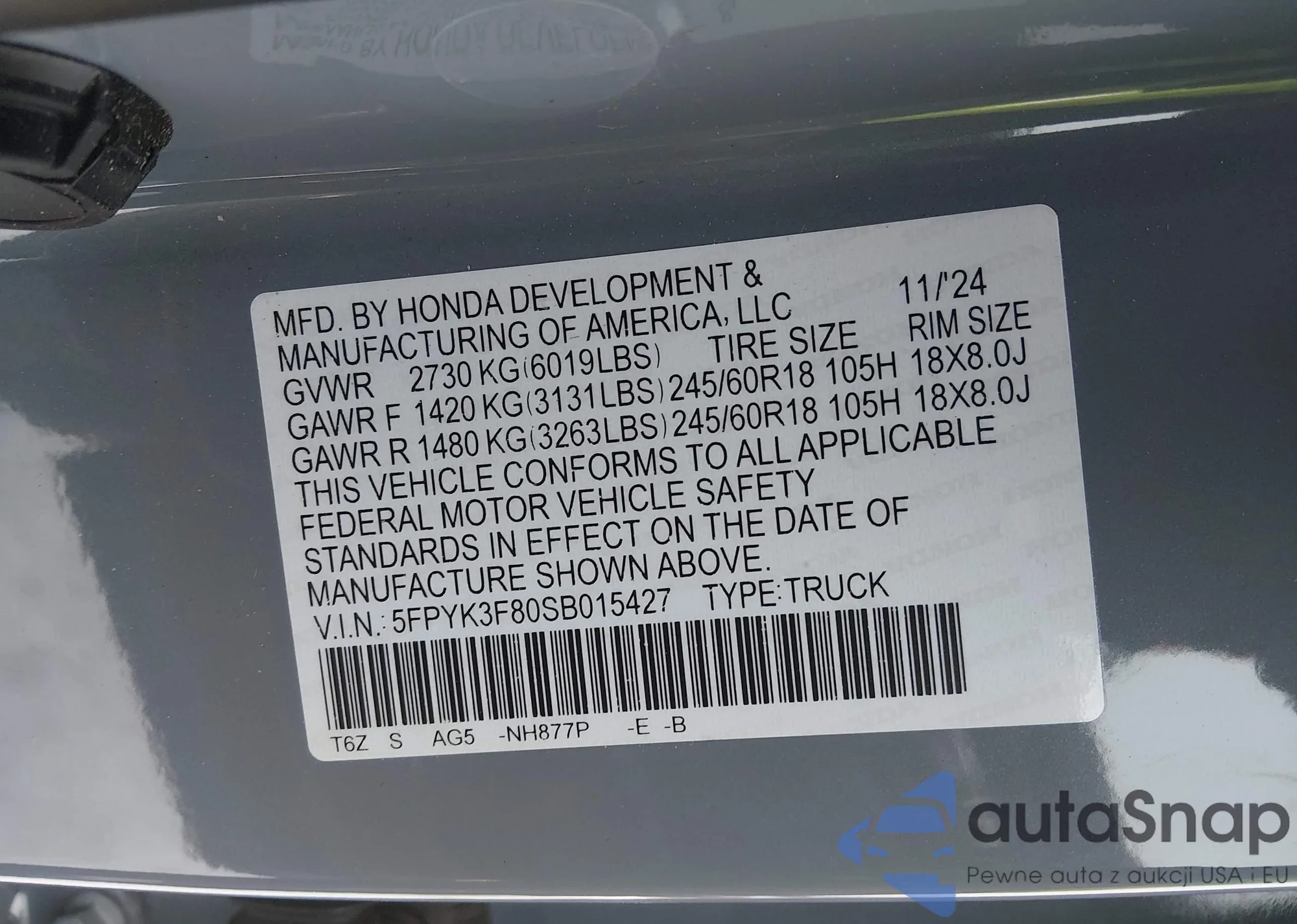 • VIN 5FPYK3F80SB015427