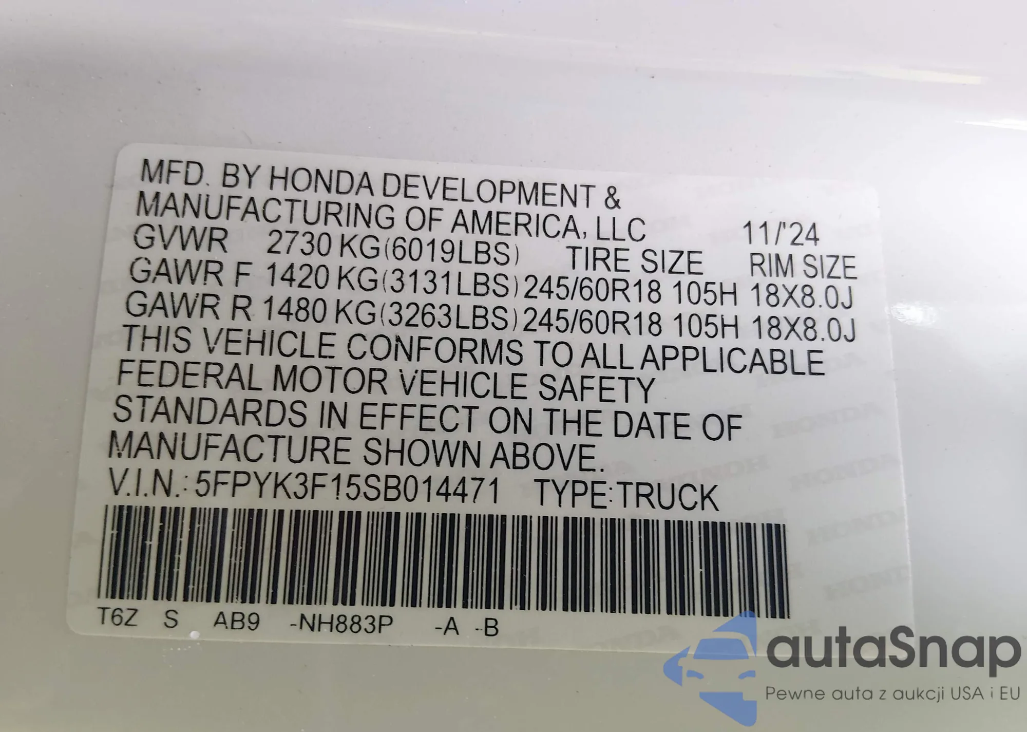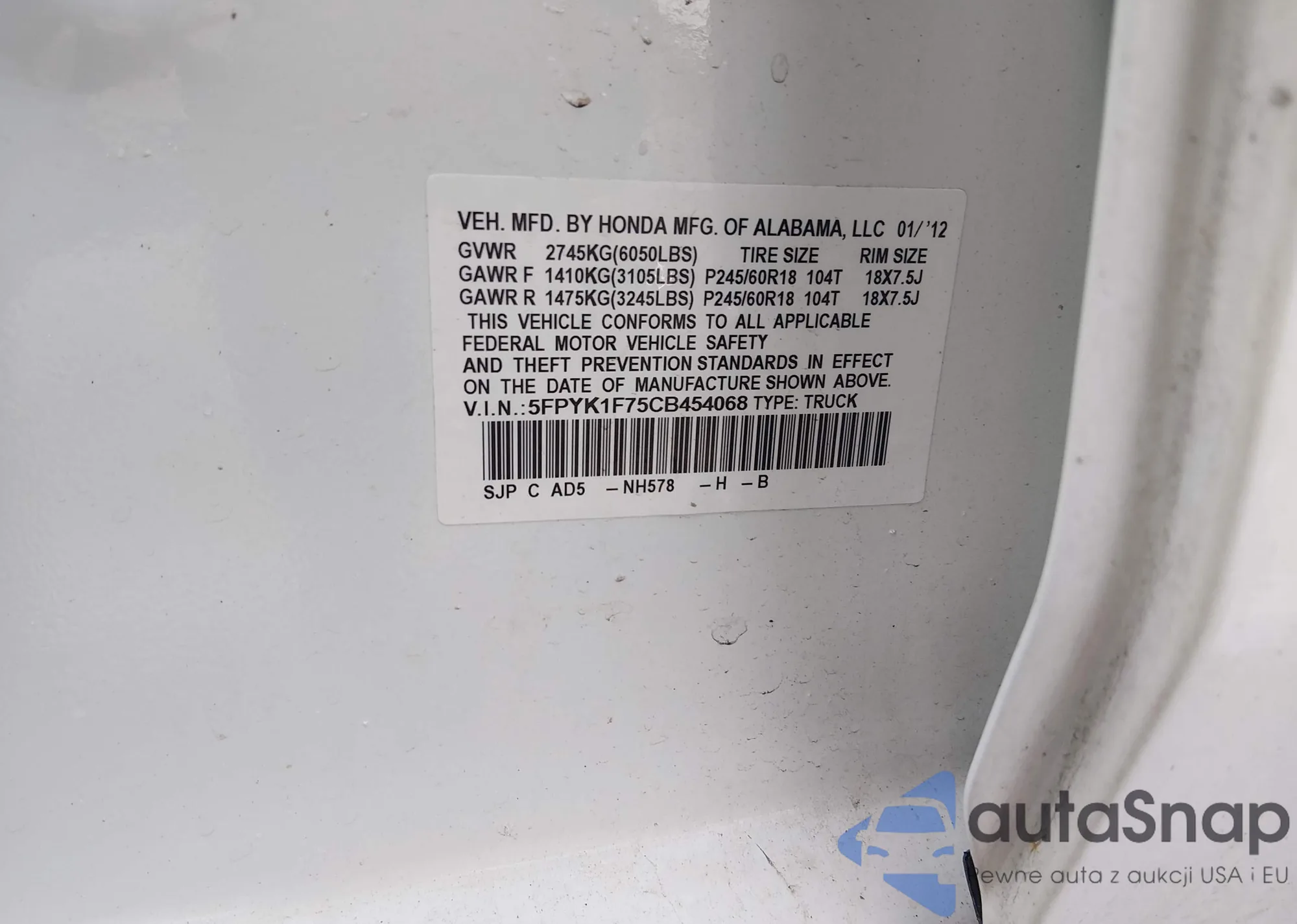 • VIN 5FPYK1F75CB454068