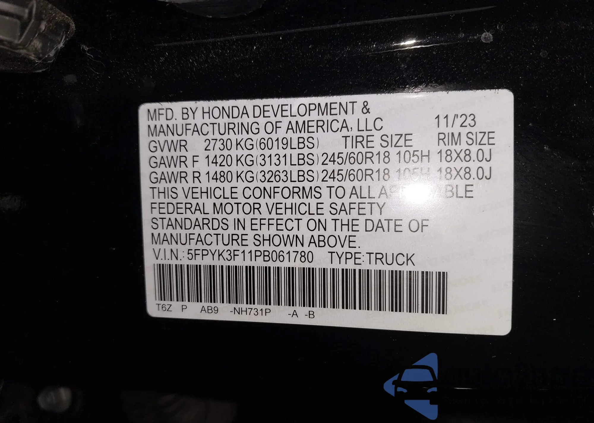 • VIN 5FPYK3F11PB061780