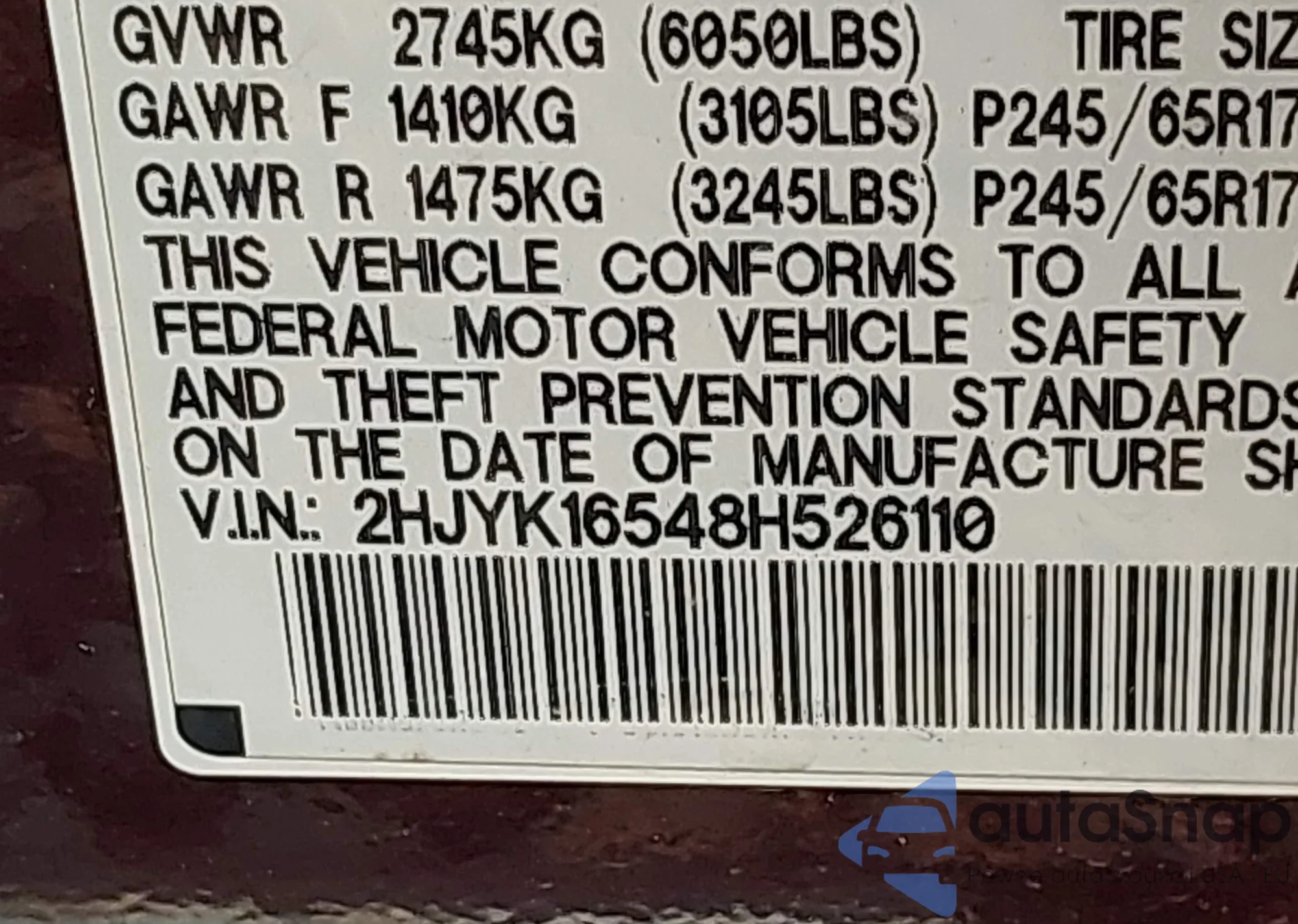 • VIN 2HJYK16548H526110
