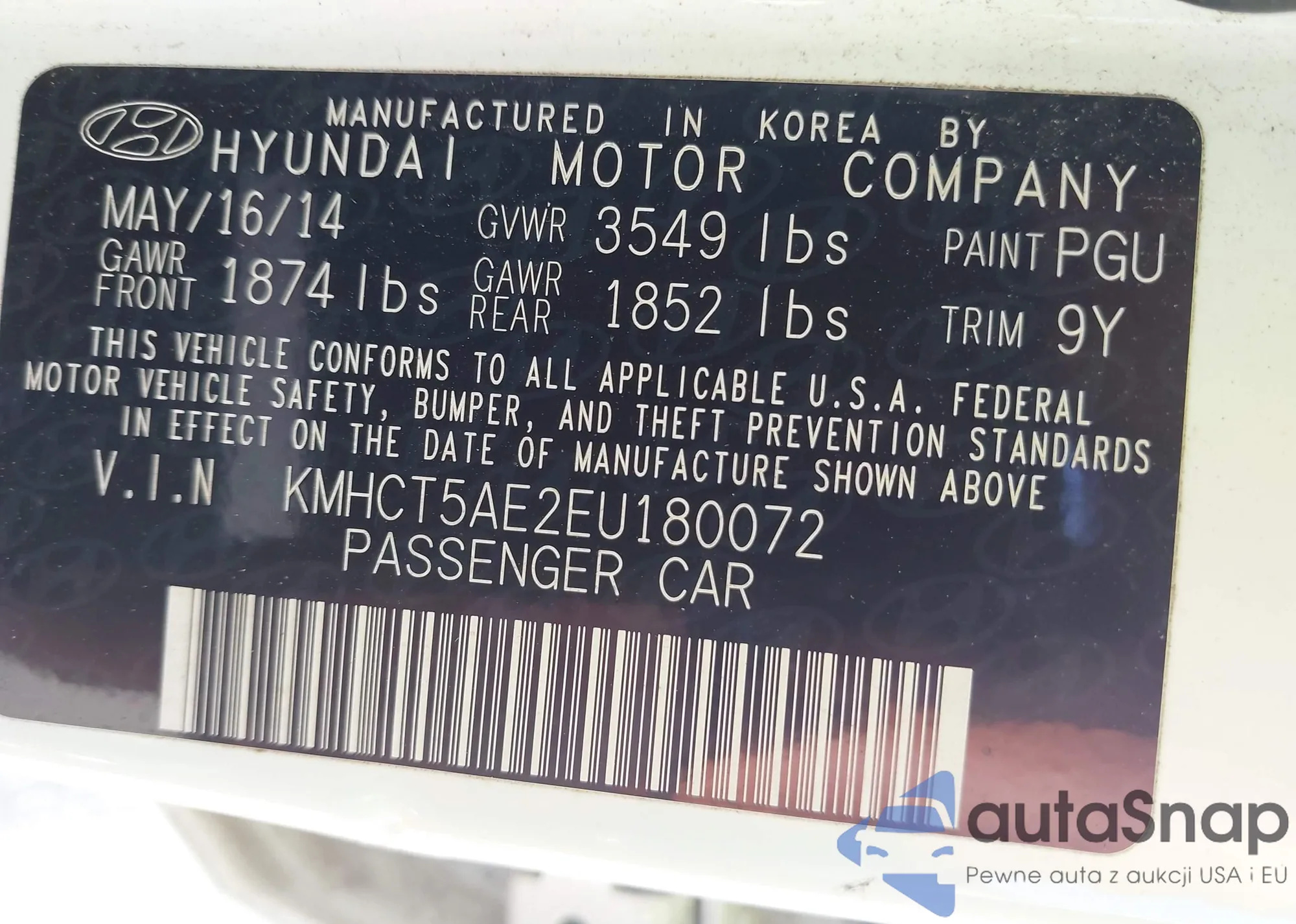 LOT: 42906307 VIN: KMHCT4AE9EU633176