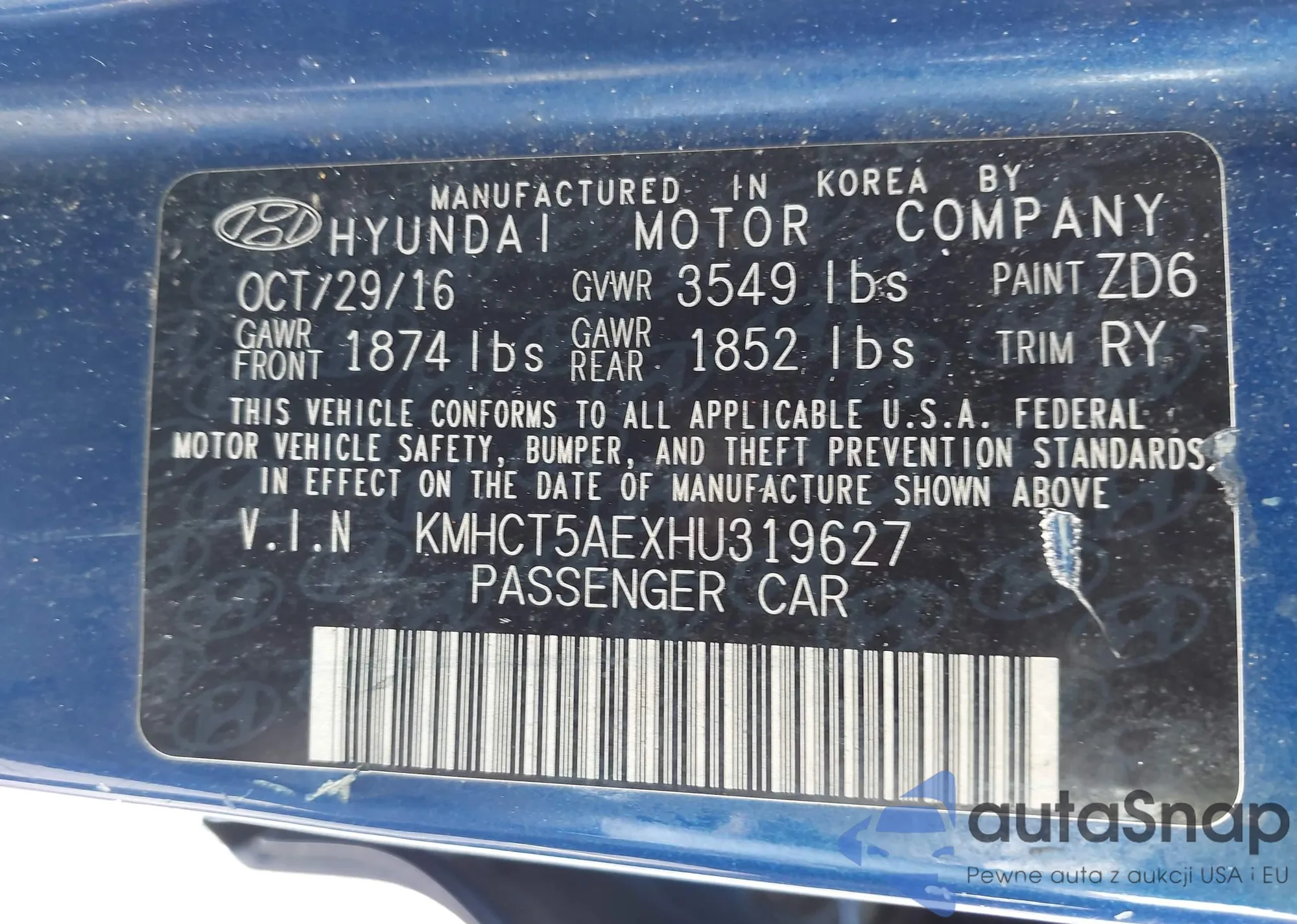 LOT: 42011068 VIN: KMHCT5AEXHU319627