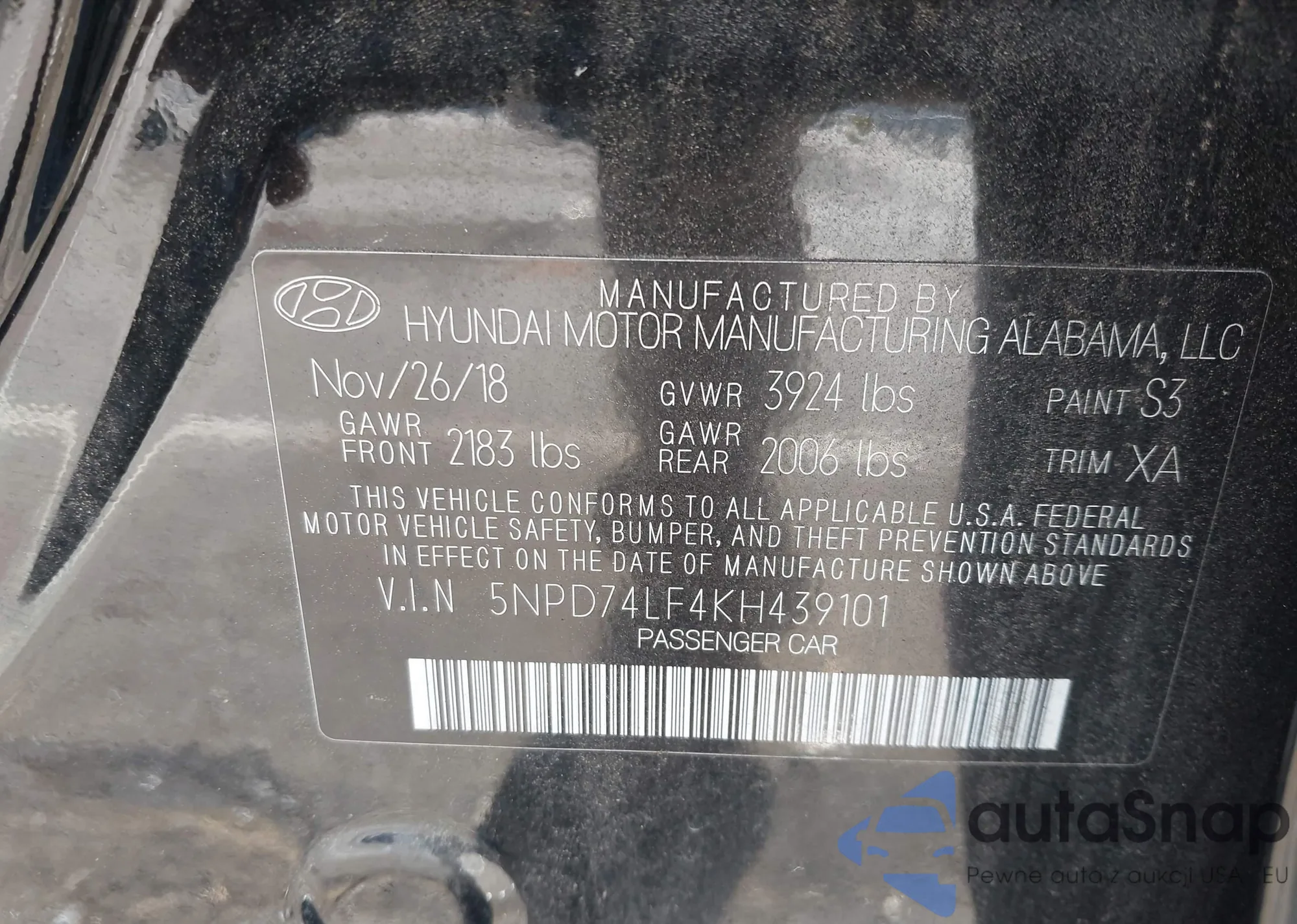 LOT: 43706118 VIN: 5NPD74LF4KH439101