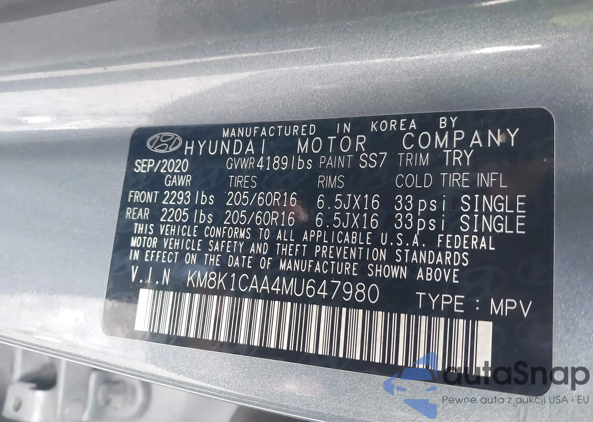 • VIN KM8K1CAA4MU647980