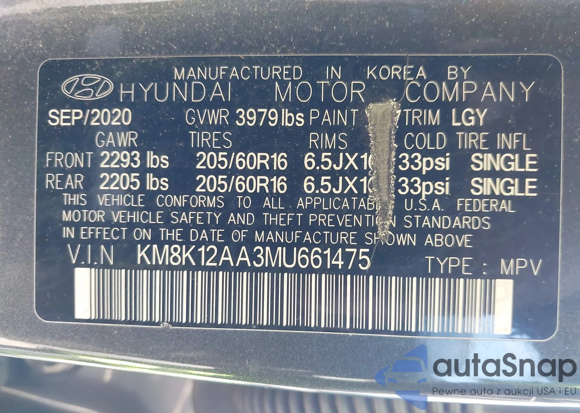 LOT: 43891393 VIN: KM8K12AA3MU661475
