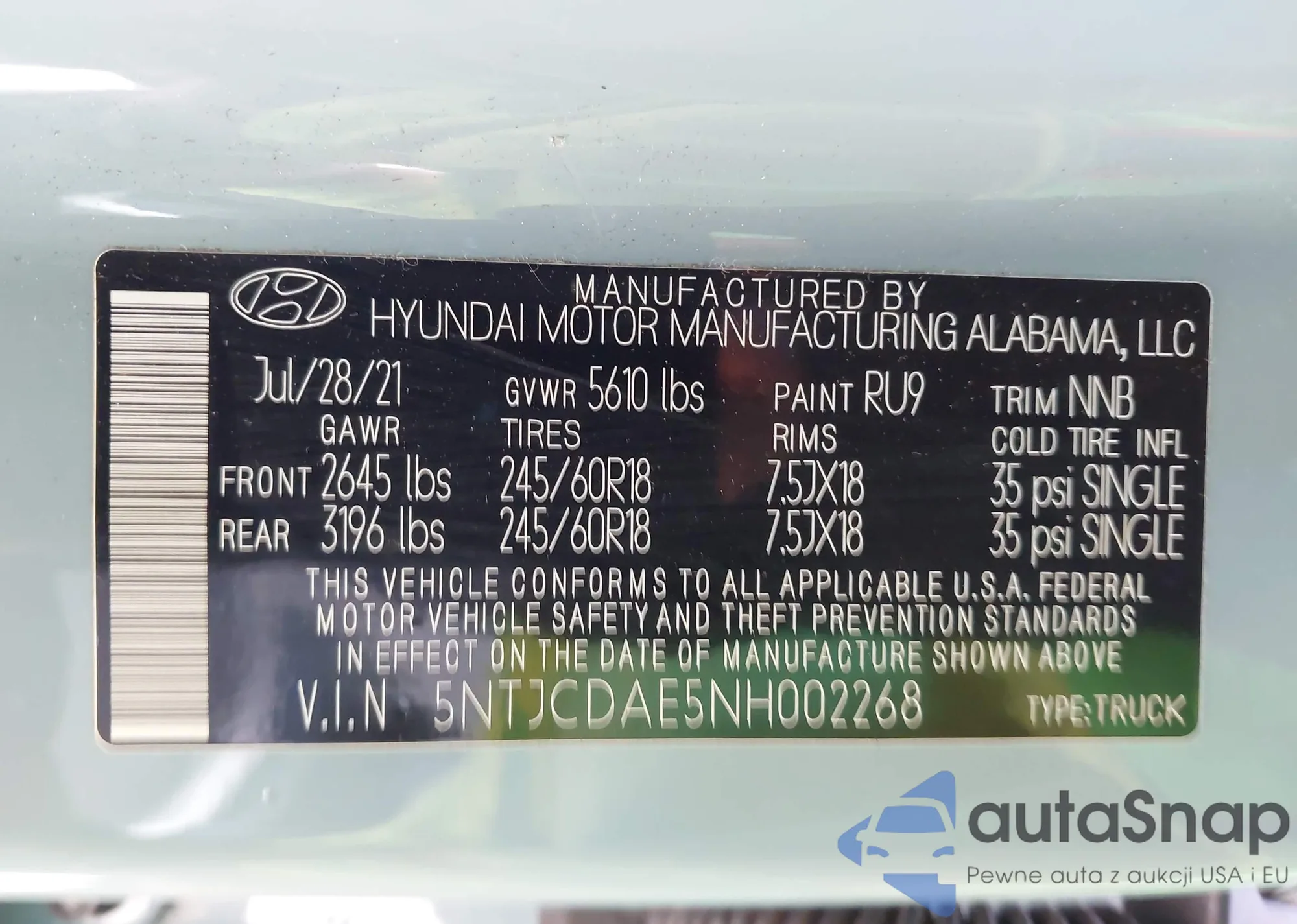 • VIN 5NTJCDAE5NH002268