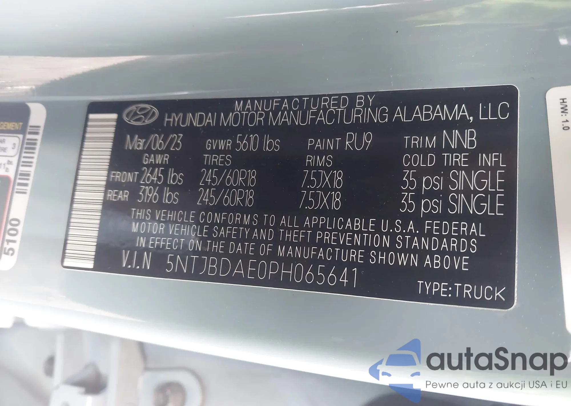 • VIN 5NTJBDAE0PH065641