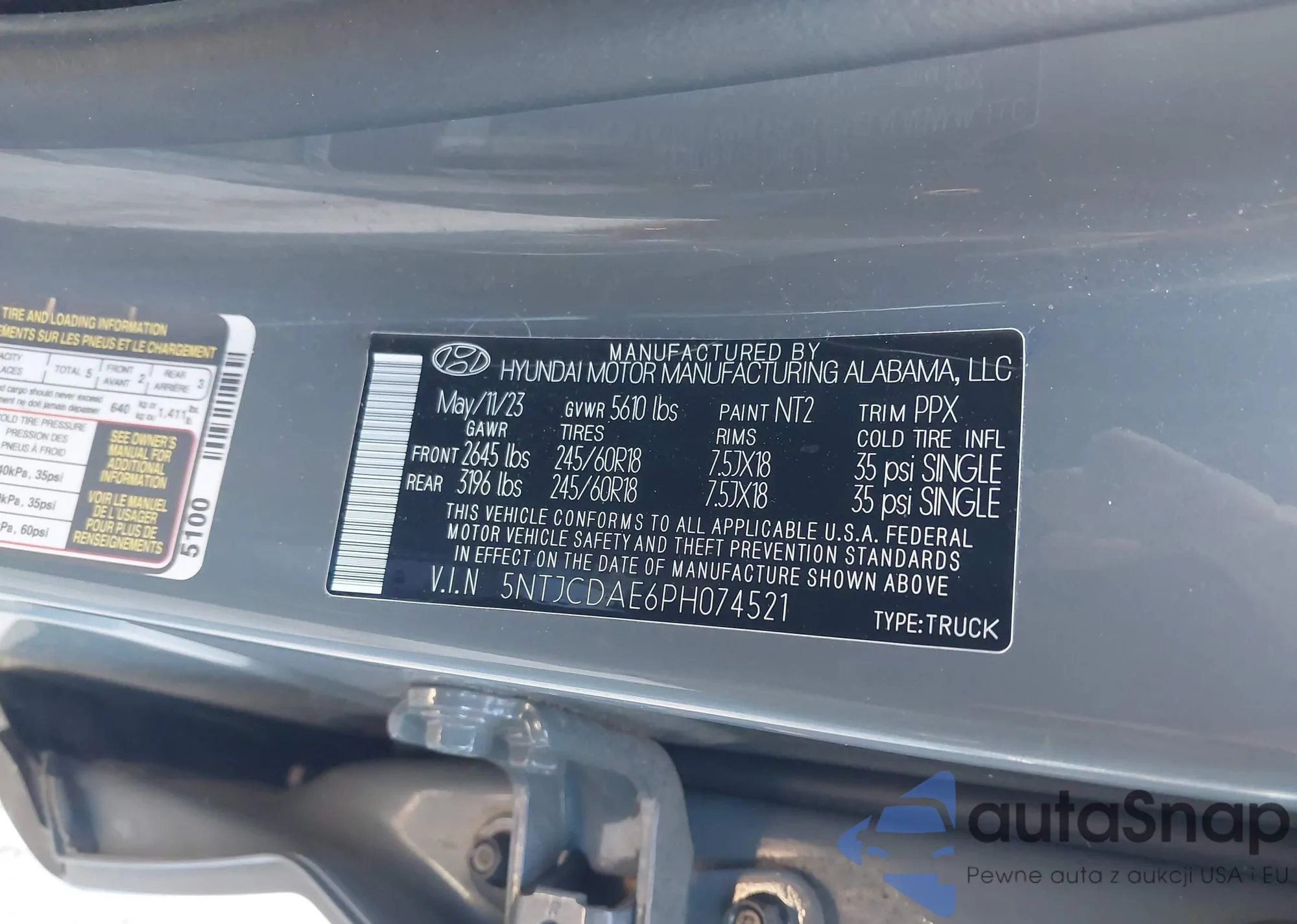 • VIN 5NTJCDAE6PH074521